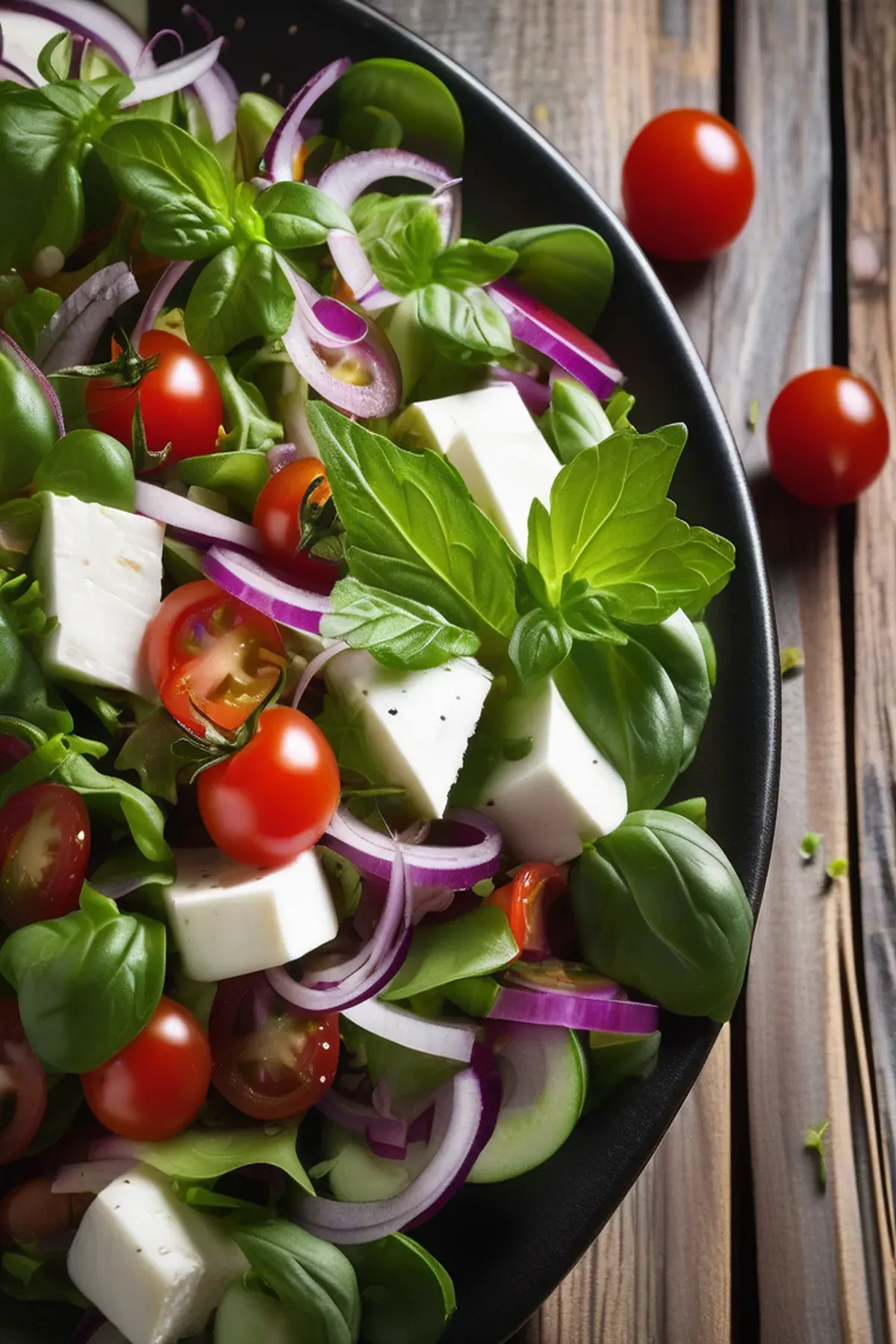 A refreshing salad with creamy mozzarella, juicy tomatoes, and crunchy Mediterranean vegetables.
