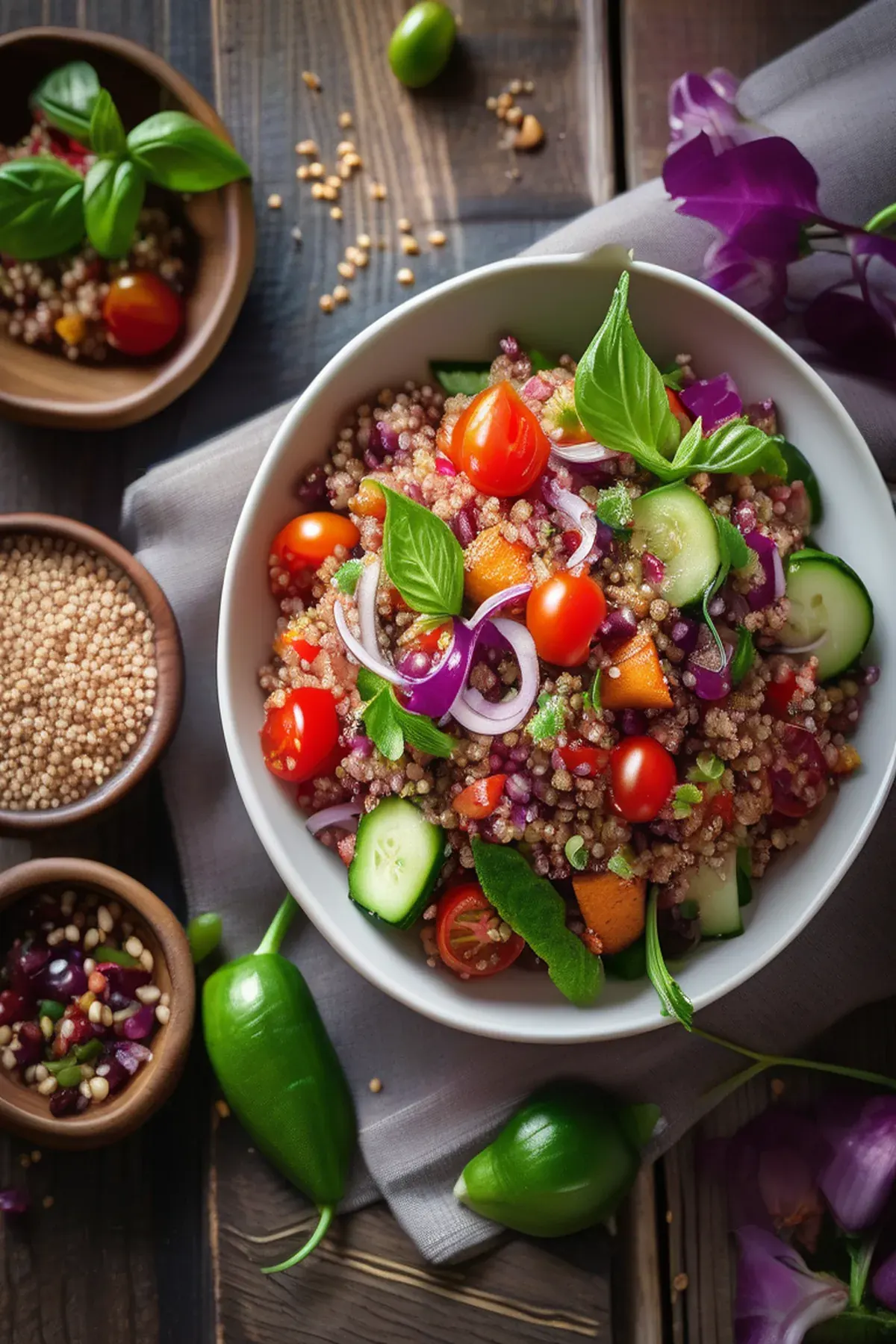 A fresh and flavorful salad featuring quinoa, roasted vegetables, and a tangy vinaigrette.