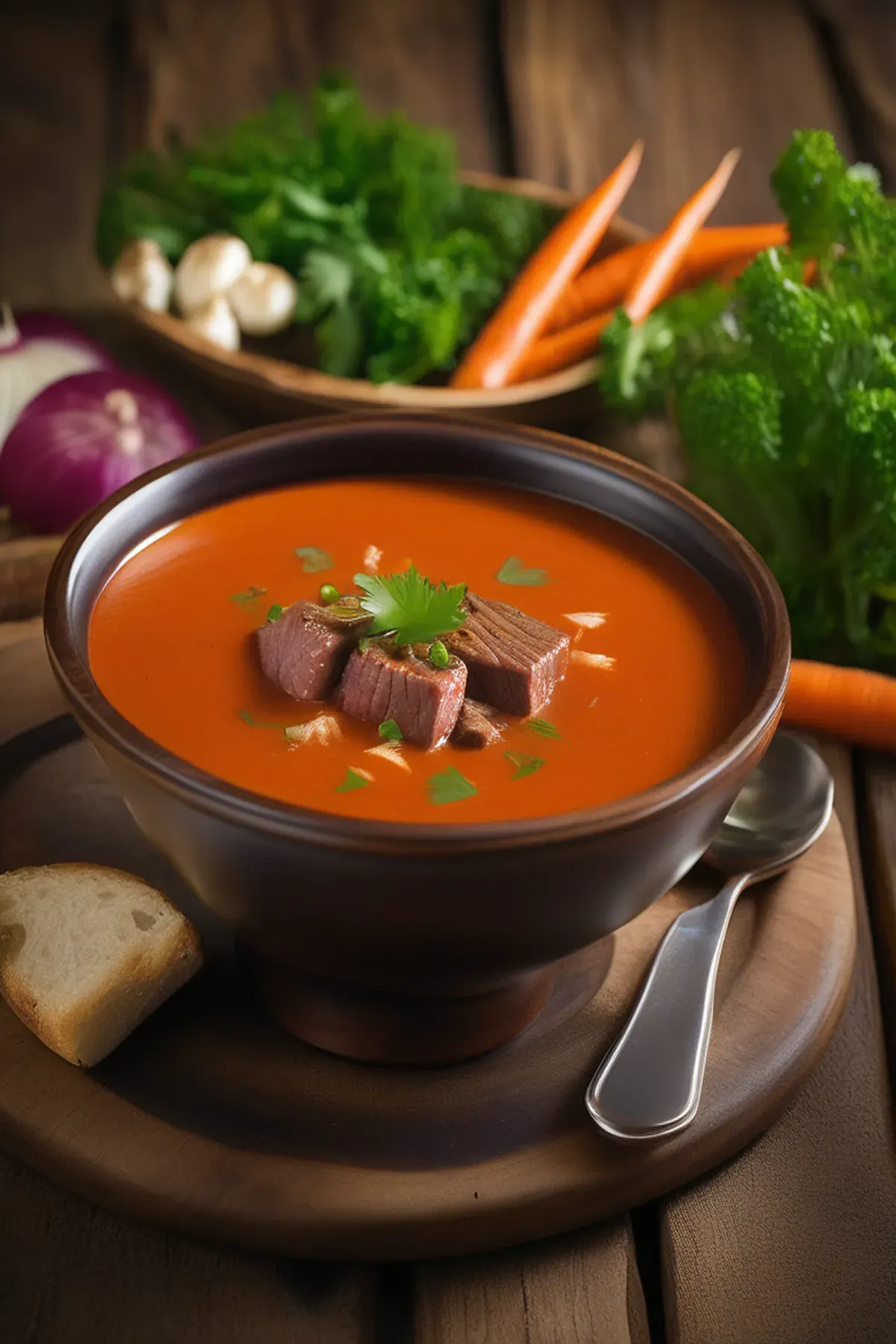 A rich and velvety soup featuring tender beef, roasted vegetables, and a silky cream base that delivers deep, comforting flavors in every spoonful.