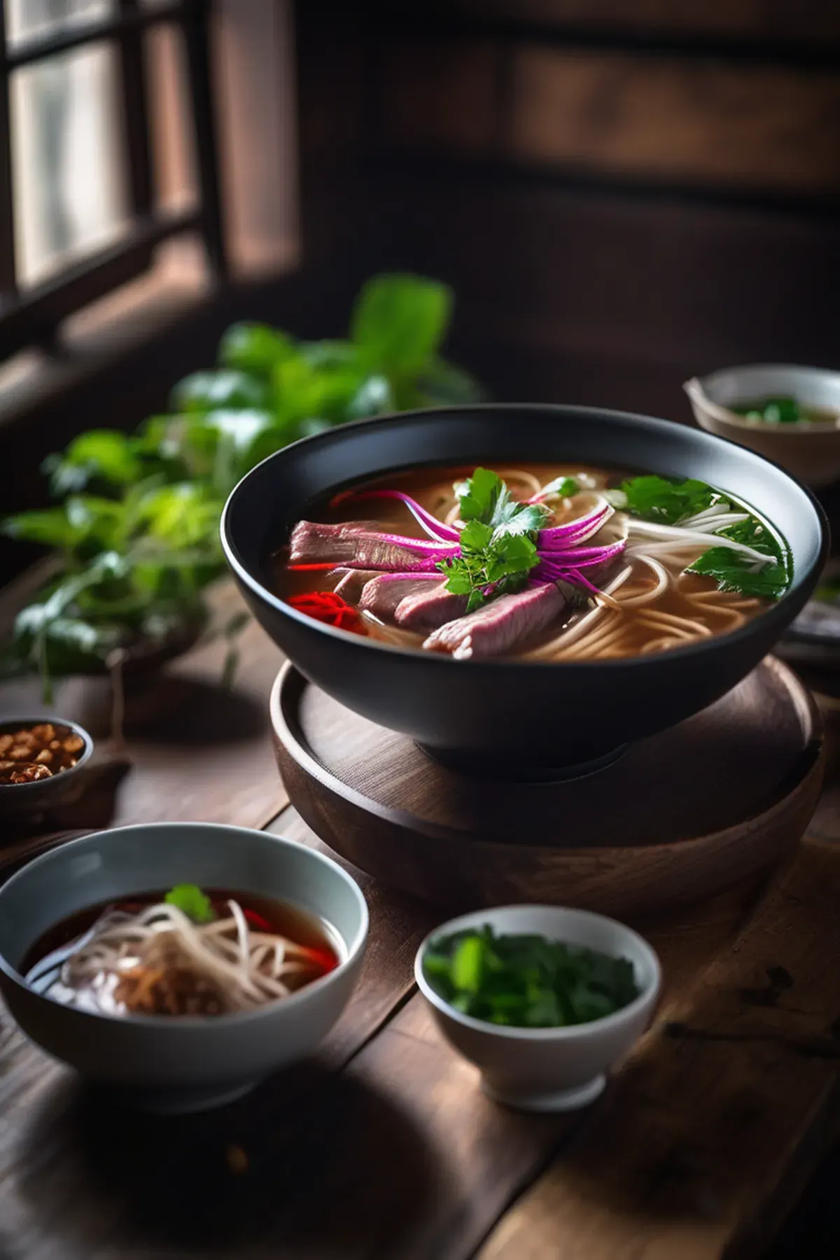 A fragrant Vietnamese beef noodle soup featuring tender beef slices in a deeply flavoured broth infused with star anise, cinnamon, and charred onions, served with fresh herbs and rice noodles.