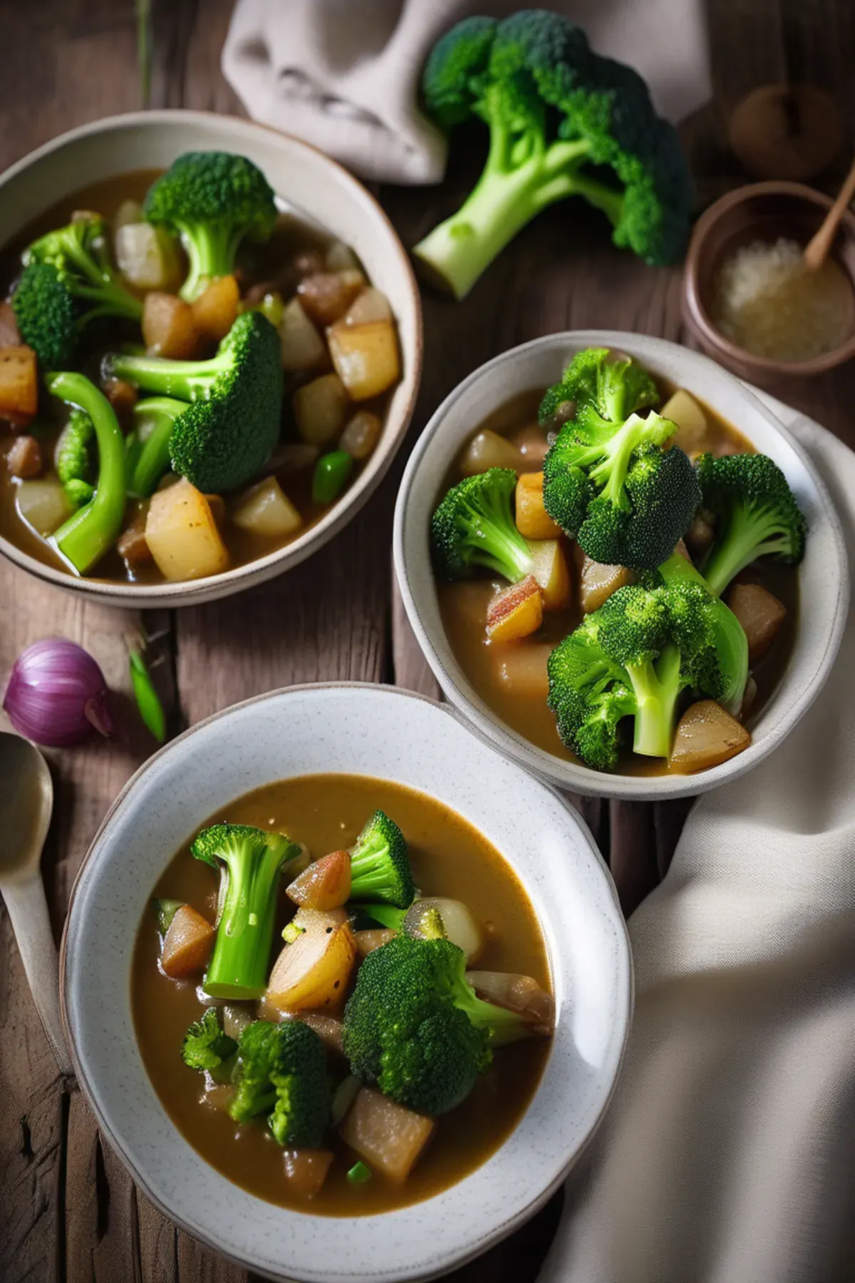 A luxurious and warming stew featuring tender broccoli florets in a creamy Stilton cheese sauce, enriched with caramelized onions and fresh thyme. Perfect for a cosy dinner with crusty bread.