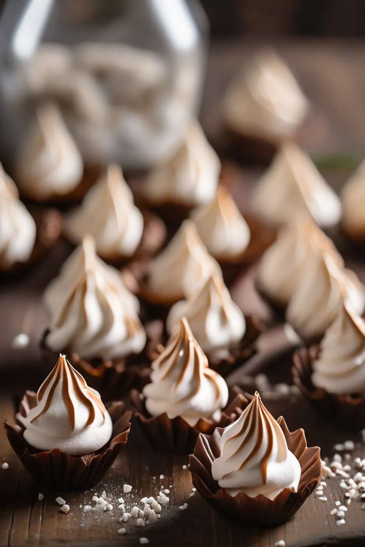 Crispy brown butter meringue kisses with a delicate balance of sweetness and savory flavors.