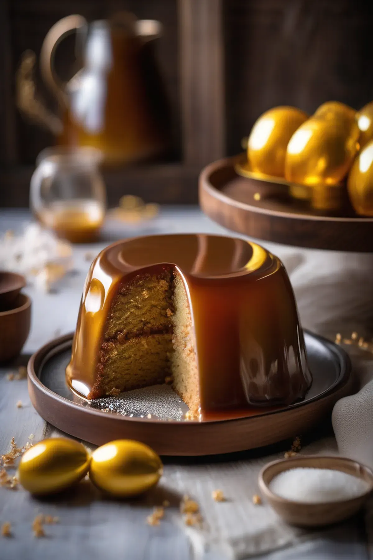 Indulge in the rich, caramelized flavors of this decadent cake, topped with a glossy mirror glaze.
