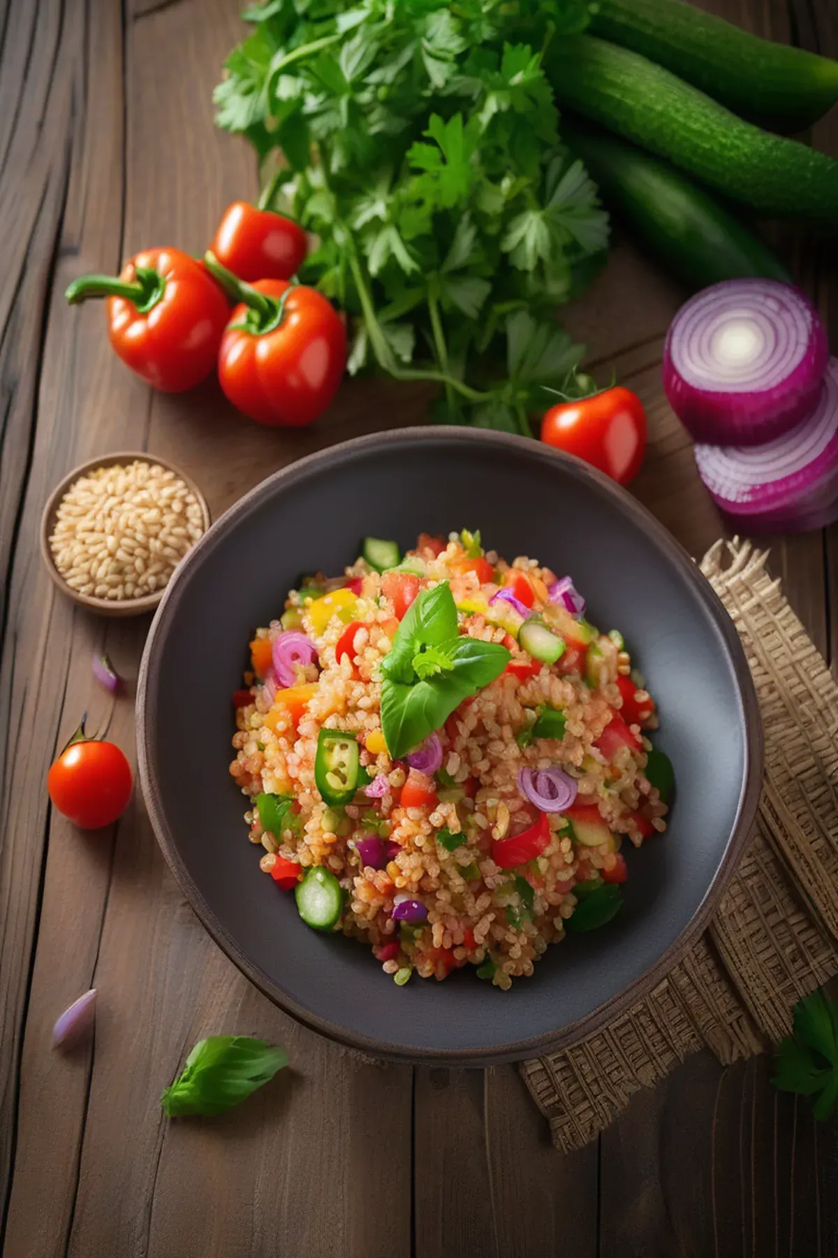 A simple, nutritious salad featuring bulgur wheat and a variety of vegetables.