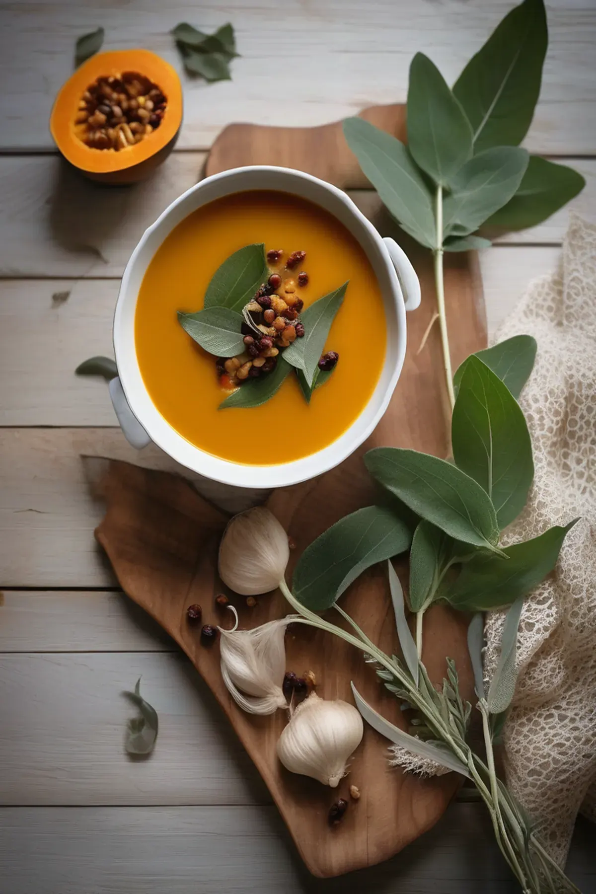 Ladle the potage into bowls and garnish each with crispy sage leaves, a light drizzle of sage-infused oil, and a crack of fresh black pepper.