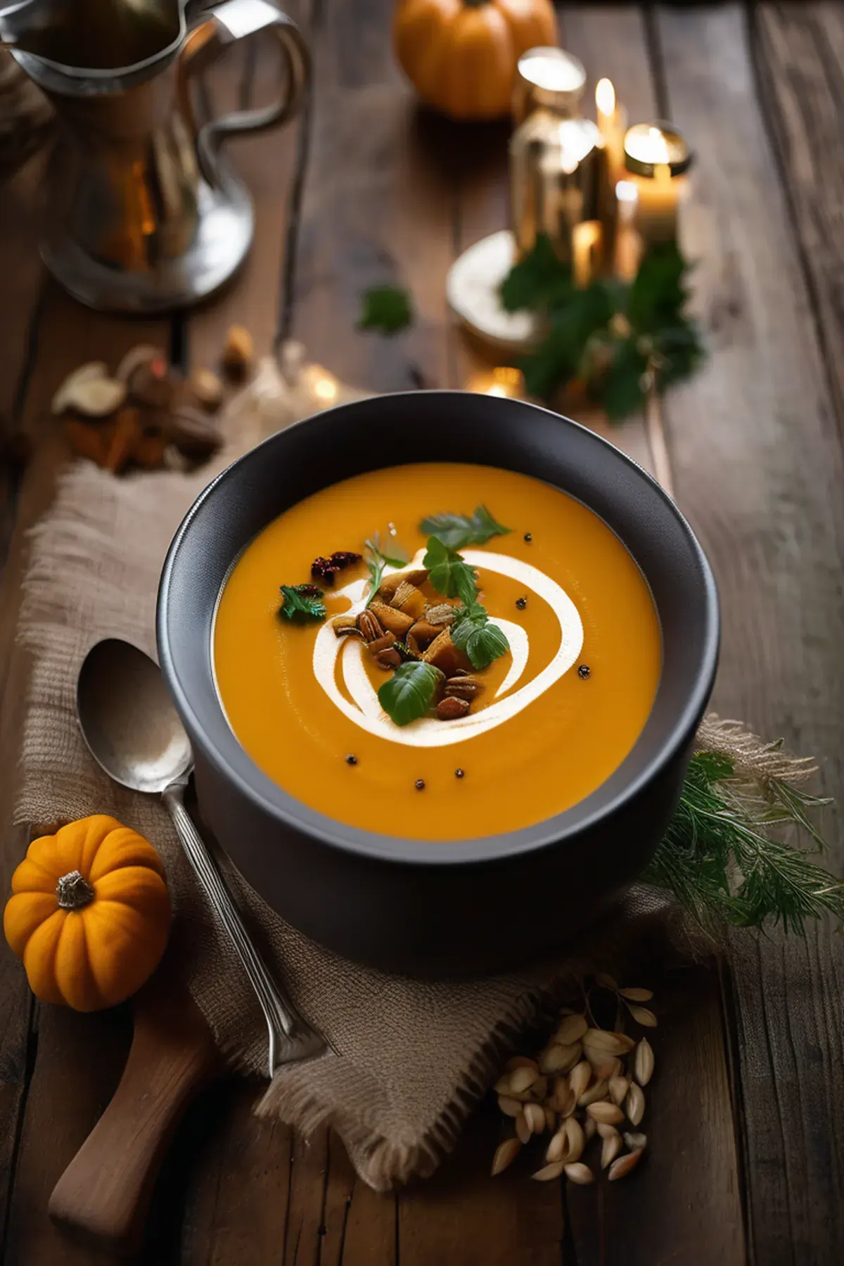 A silky, luxurious autumn soup featuring roasted butternut squash with warm spices, finished with a touch of cream and crispy sage for an elegant first course.