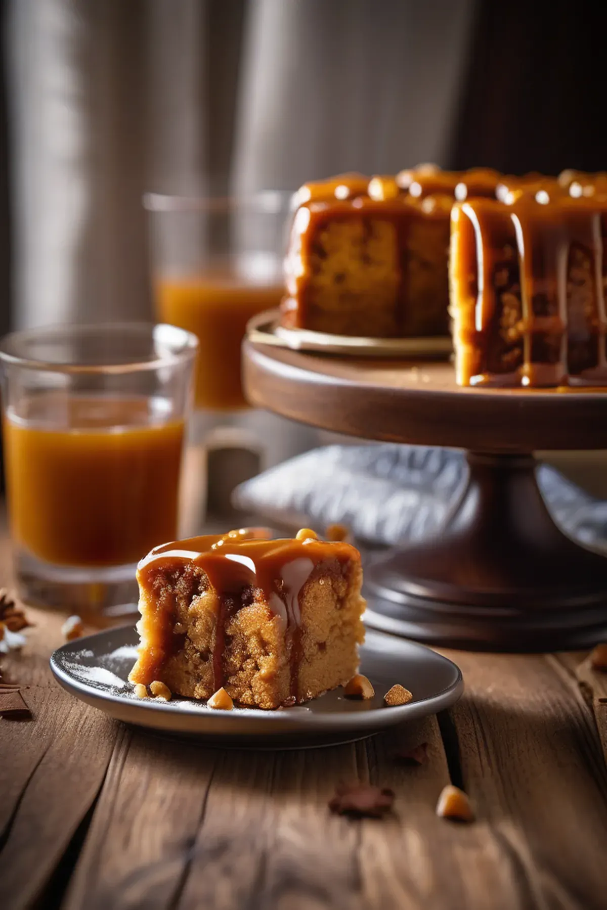 A rich and indulgent dessert featuring a moist, butterscotch-infused cake, topped with a crunchy streusel topping and served warm.
