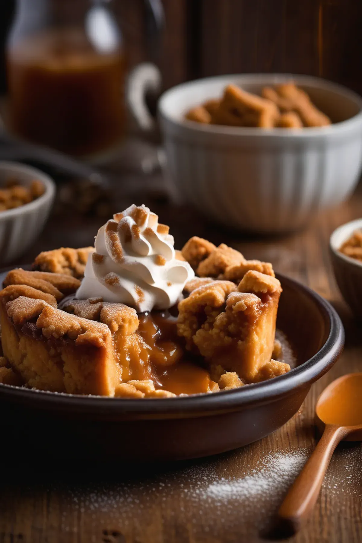A rich and comforting dessert filled with butterscotch goodness, topped with a crumbly biscuit crust.