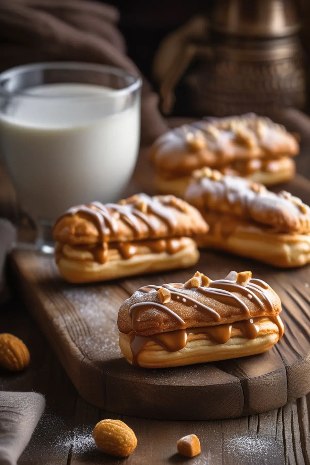 To assemble the eclairs, fill a piping bag with the butterscotch custard and pipe into the cooled pastries.