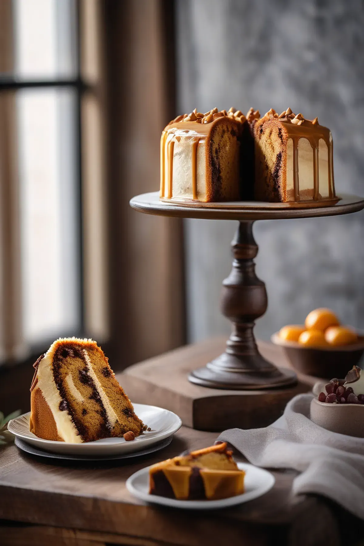 Rich and moist cake with a creamy butterscotch center, swirled with a marbled design.