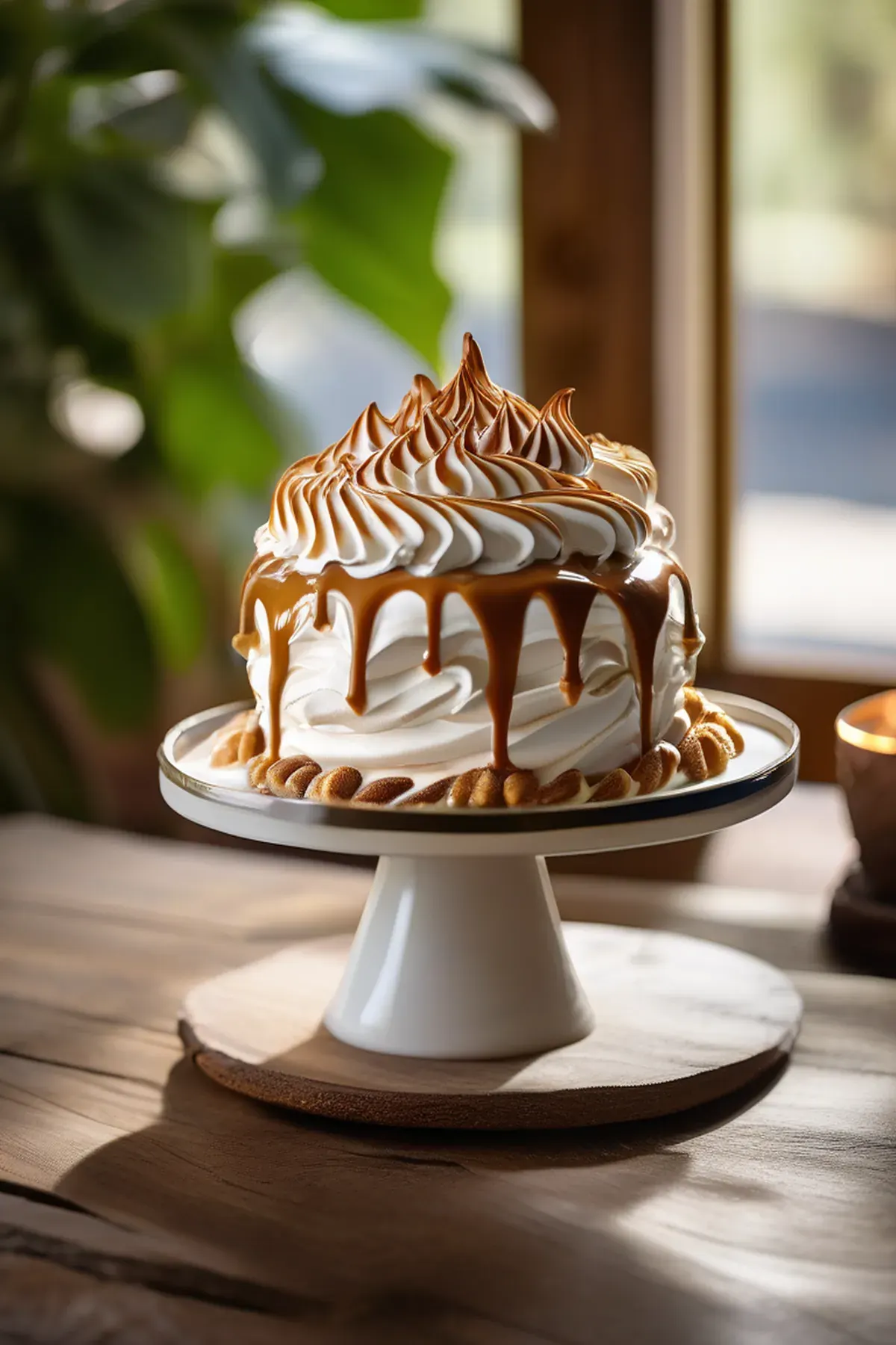 Spread the meringue topping evenly over the ice cream and caramel sauce.