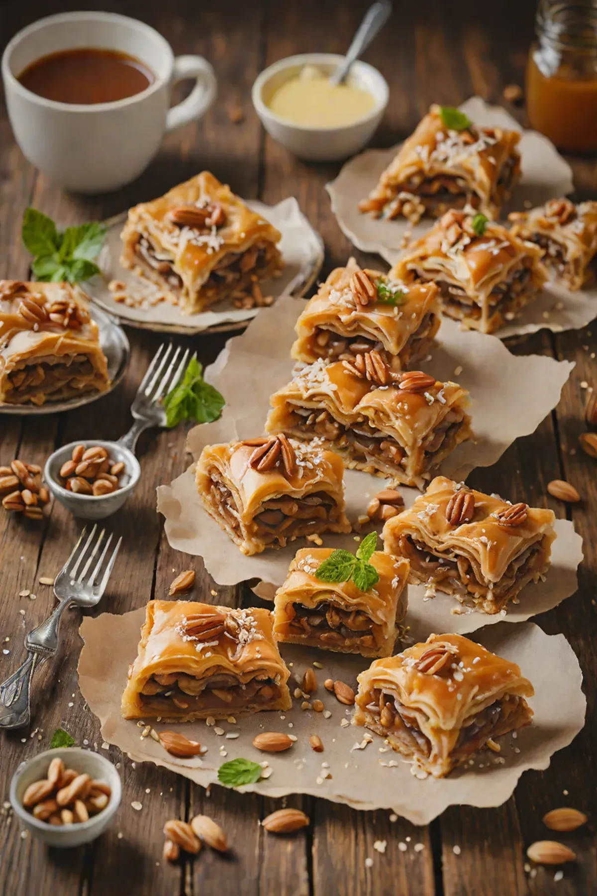 Make the phyllo dough by mixing flour, cold butter, eggs, and salt in a bowl until a dough forms.