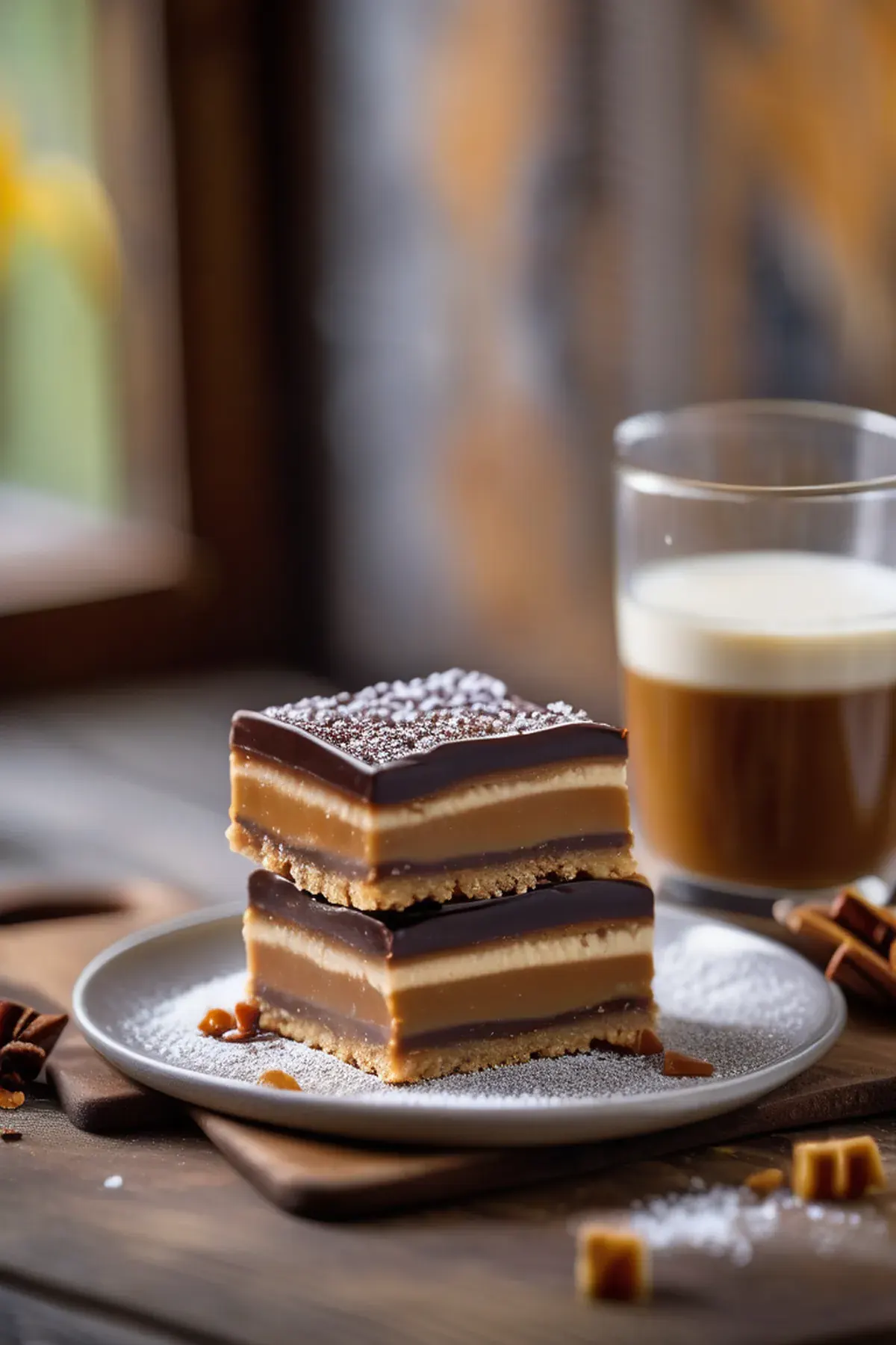 Rich, gooey caramel nestled between layers of crumbly biscuit base and creamy filling, all held together with a delicate touch.