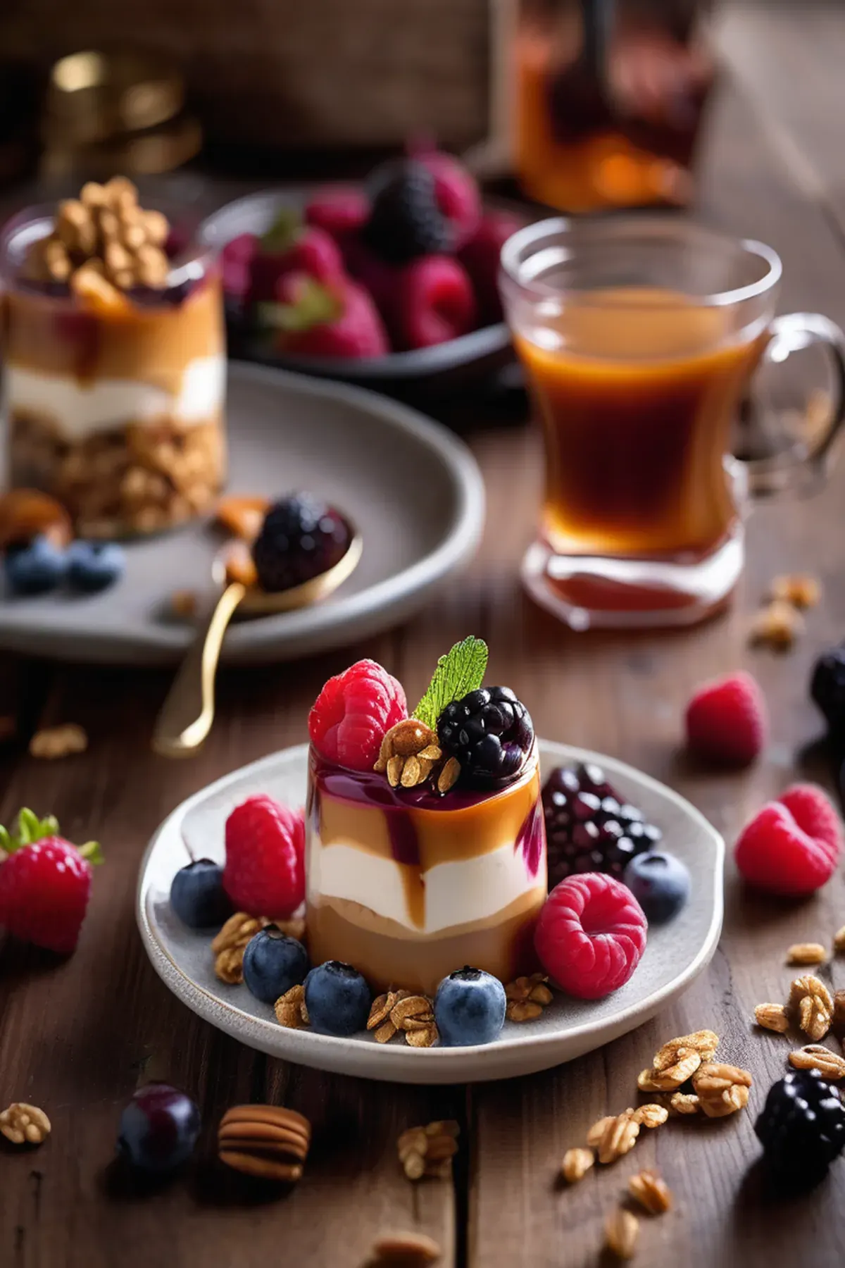 To assemble the parfait, layer a spoonful of granola, a dollop of yogurt mixture, and a spoonful of mixed berries in a glass or jar.