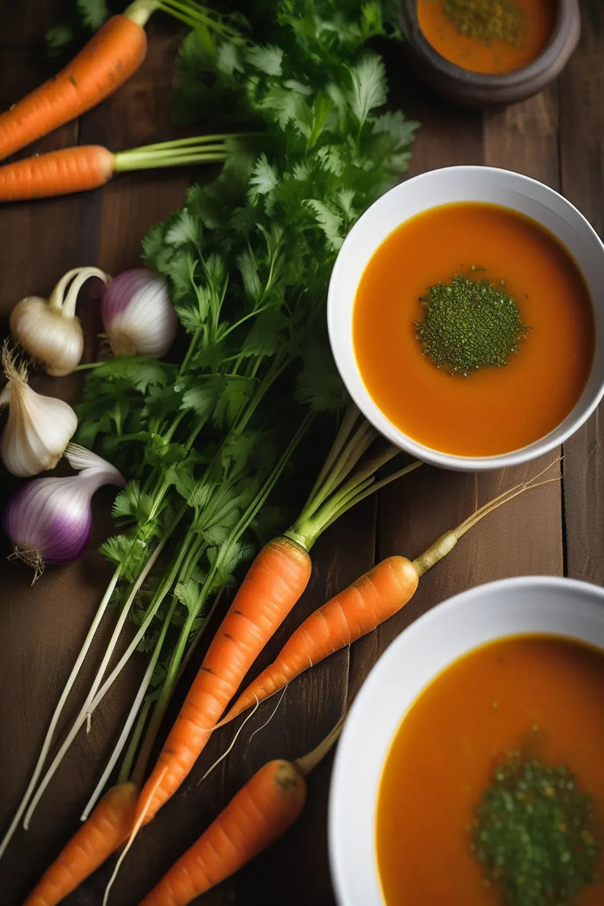 A warming, aromatic broth infused with roasted carrots and toasted coriander seeds, finished with fresh herbs and a squeeze of citrus for brightness.