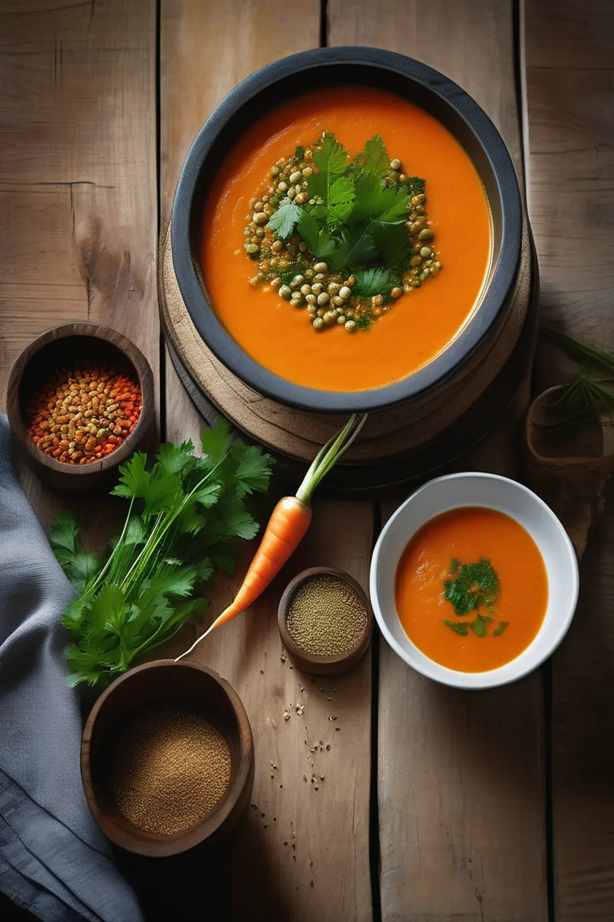 A vibrant, warming soup that combines sweet roasted carrots with the subtle warmth of toasted coriander seeds. Finished with a touch of cream and fresh herbs, it's elegant yet comforting.