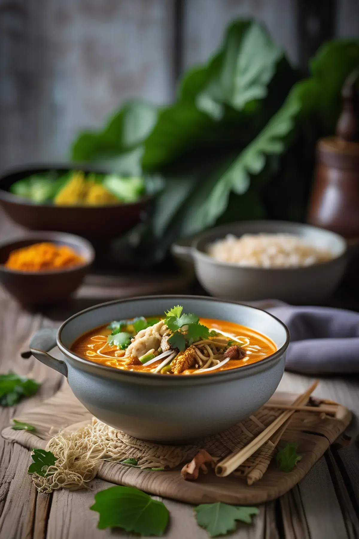 Ladle the laksa into bowls and serve immediately.