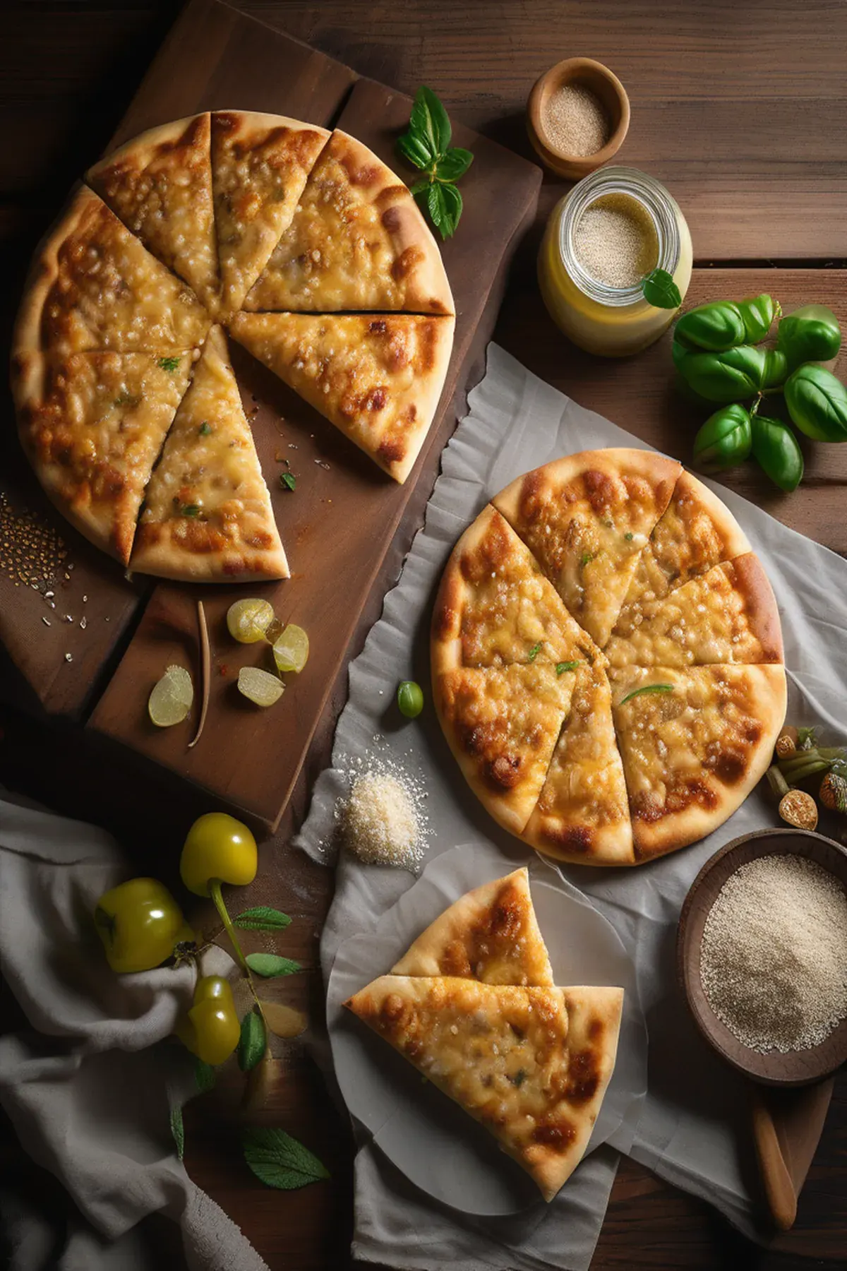 A crispy yet soft flatbread topped with melted mozzarella, aged cheddar, and aromatic herbs, perfect as an appetizer or alongside soups and salads.