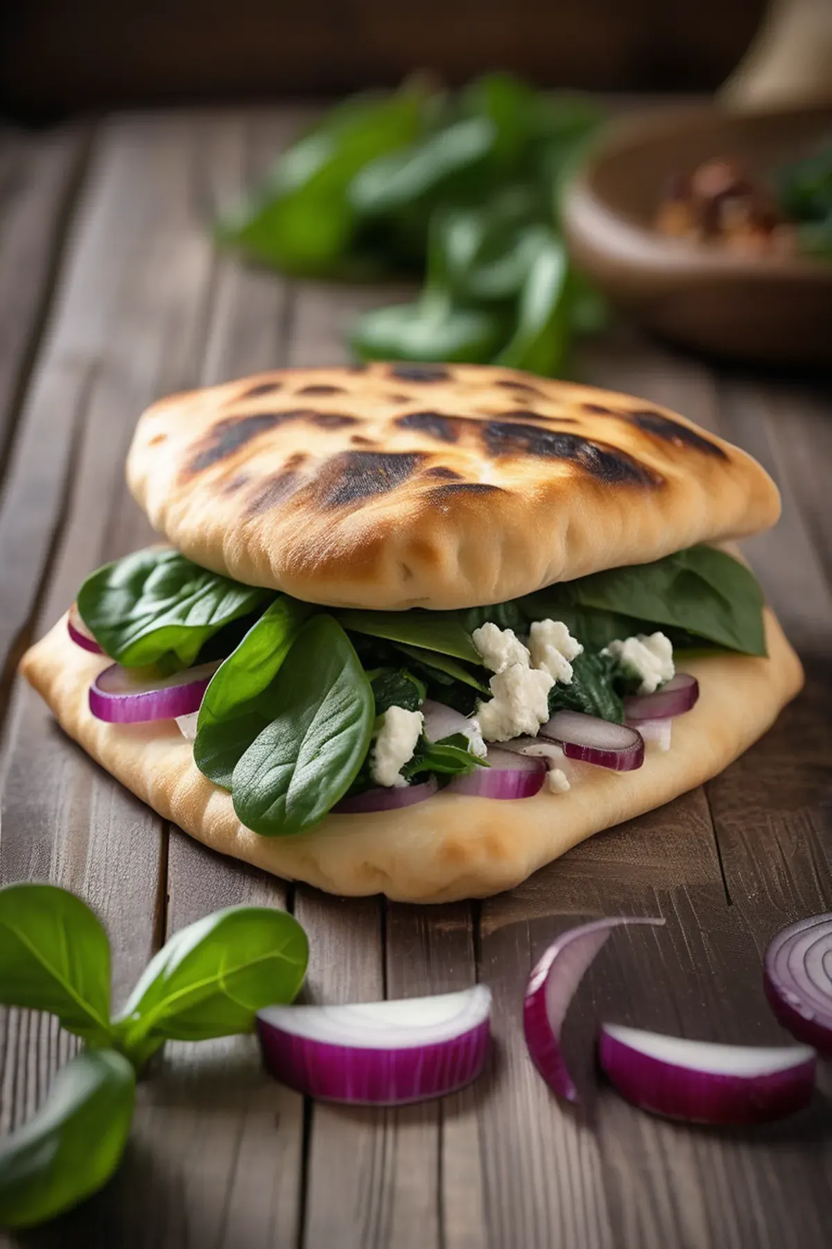 Fill each pita pocket with a generous portion of the cheese mixture, followed by the caramelized onion and spinach filling. Don't overstuff, as this can cause leakage during cooking.
