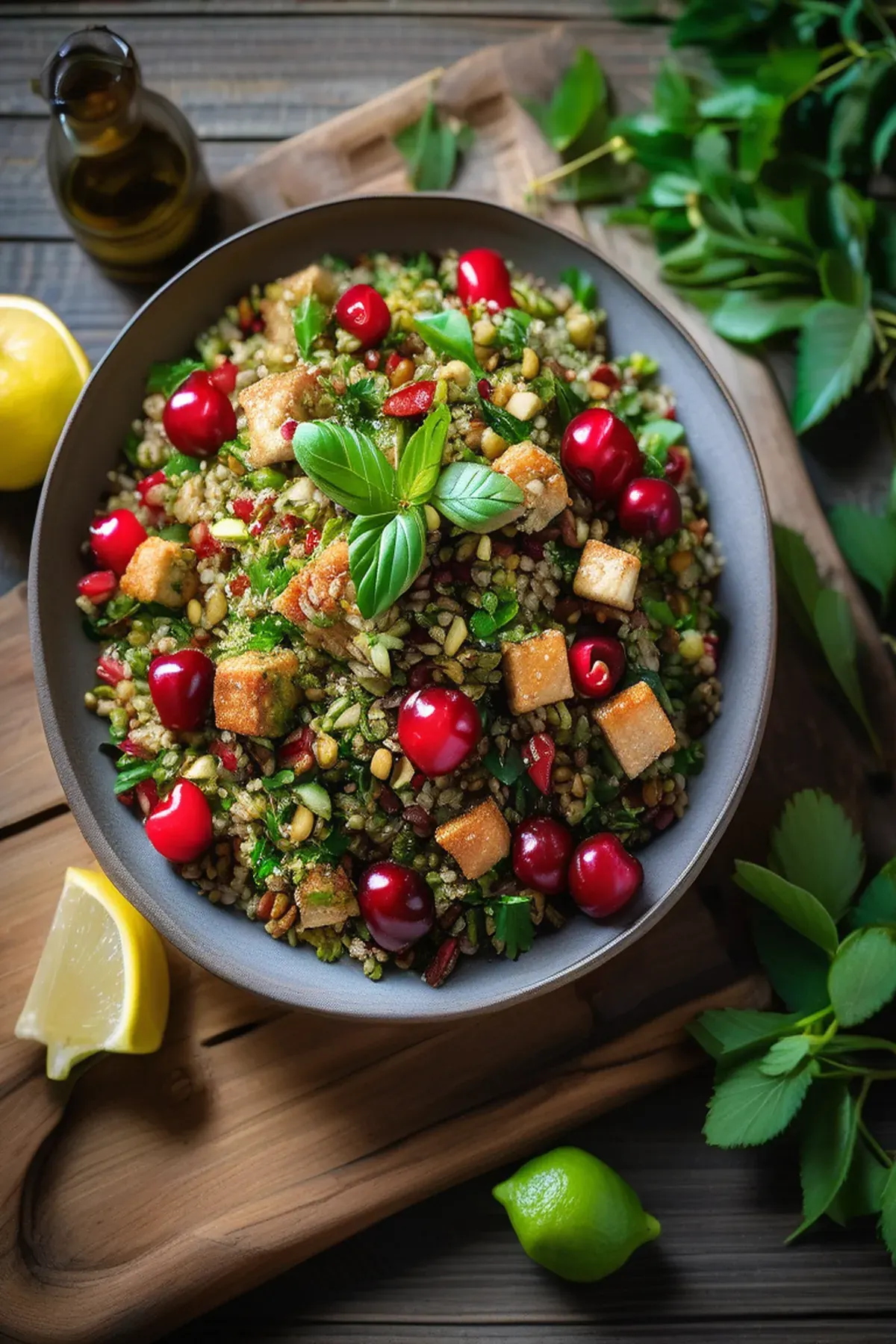 This is my go to dish when I want something fresh and satisfying but don't have much time. Cherry and pistachio tabbouleh with crispy tofu comes together in just 25 minutes and proves that healthy eating doesn't need to be complicated. The bulgur wheat is wonderfully filling and packed with fibre, keeping you satisfied for hours. What I love most is how the tart cherries and crunchy pistachios transform humble tabbouleh into something special, while the crispy tofu adds protein without any fuss. It's colourful, nutritious, and genuinely delicious.
