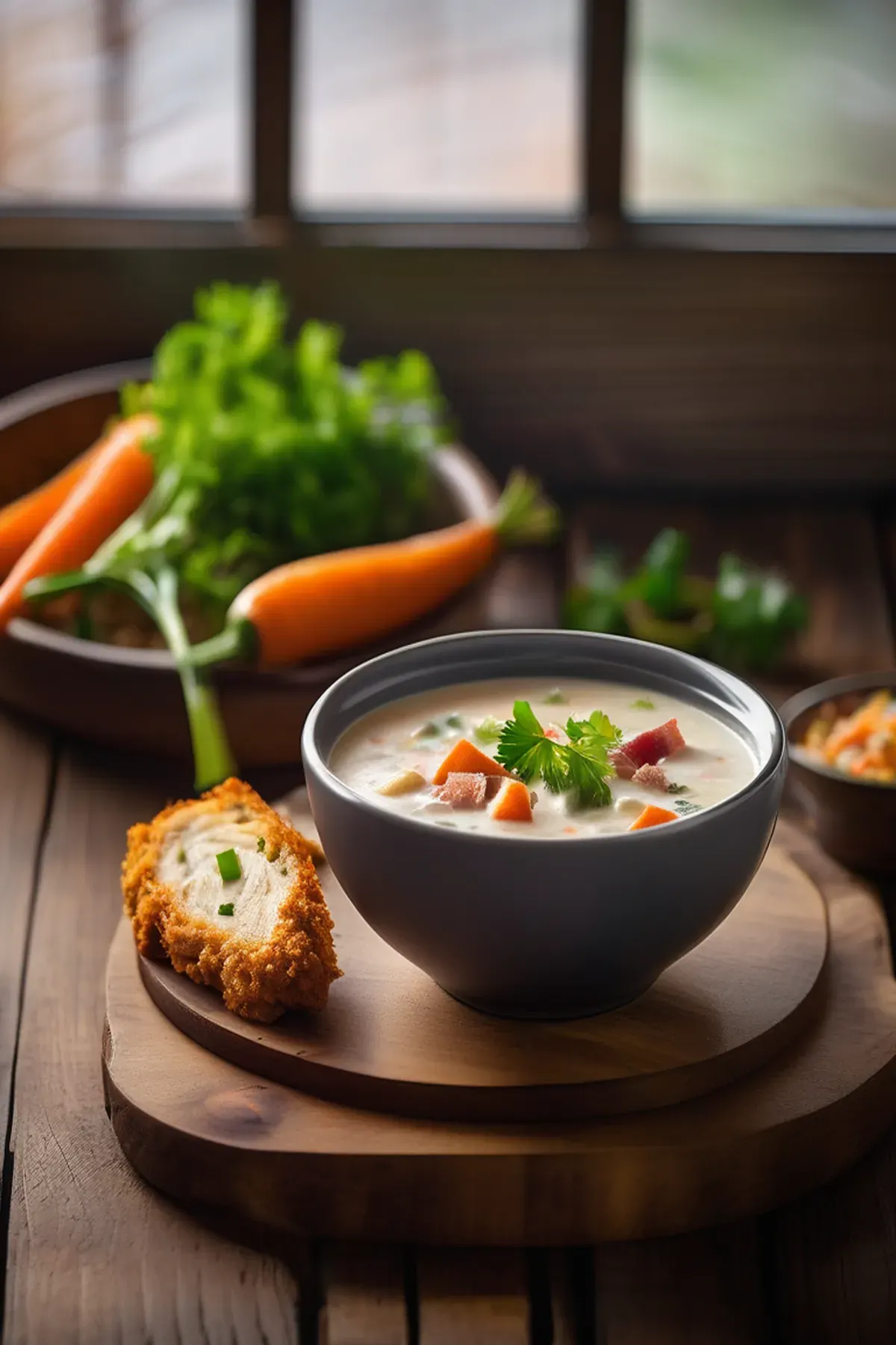 A creamy and comforting chowder loaded with tender chicken, vegetables, and crispy bacon, perfect for warming you up on cool evenings.