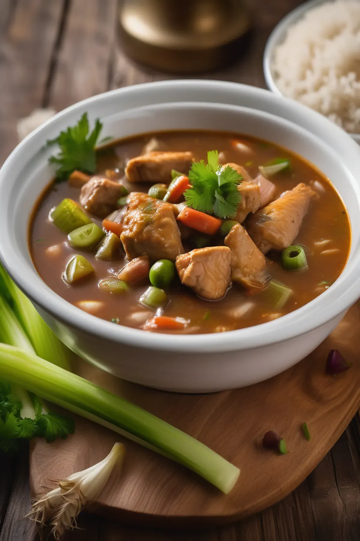 A rich and aromatic Louisiana-style gumbo with tender chicken, okra, and a deeply flavored roux base, simmered with the holy trinity of vegetables and warming spices.
