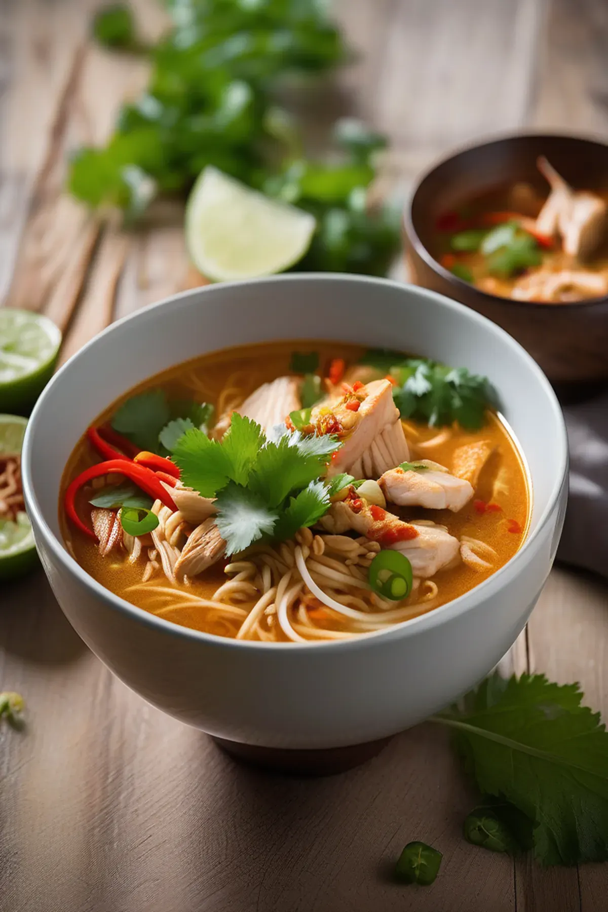 A fragrant and creamy Southeast Asian curry soup loaded with tender chicken, noodles, and fresh vegetables in a rich coconut broth infused with aromatic spices.