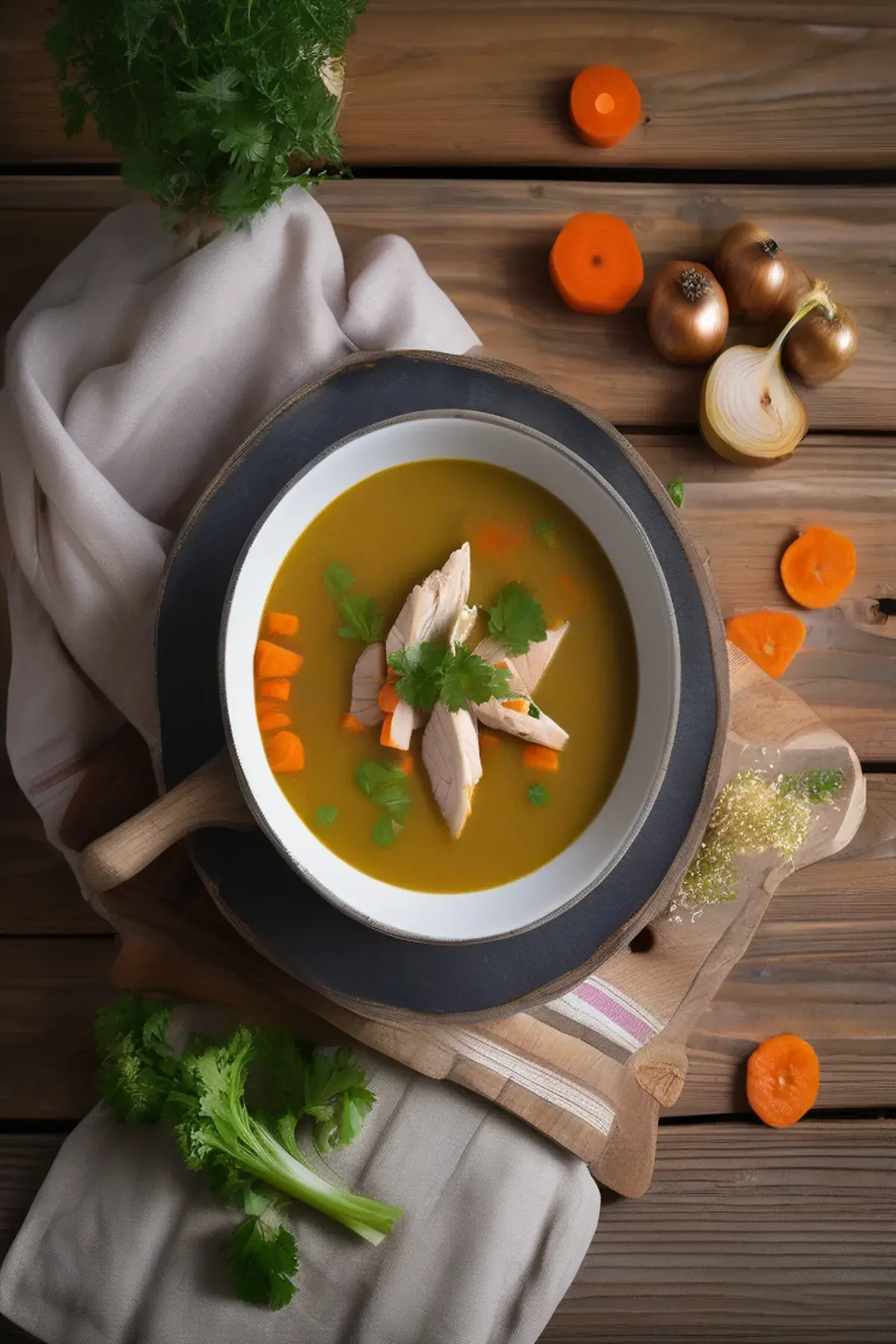 A velvety, comforting French-style soup featuring tender chicken, aromatic vegetables, and cream, perfect for a warming lunch or light dinner.