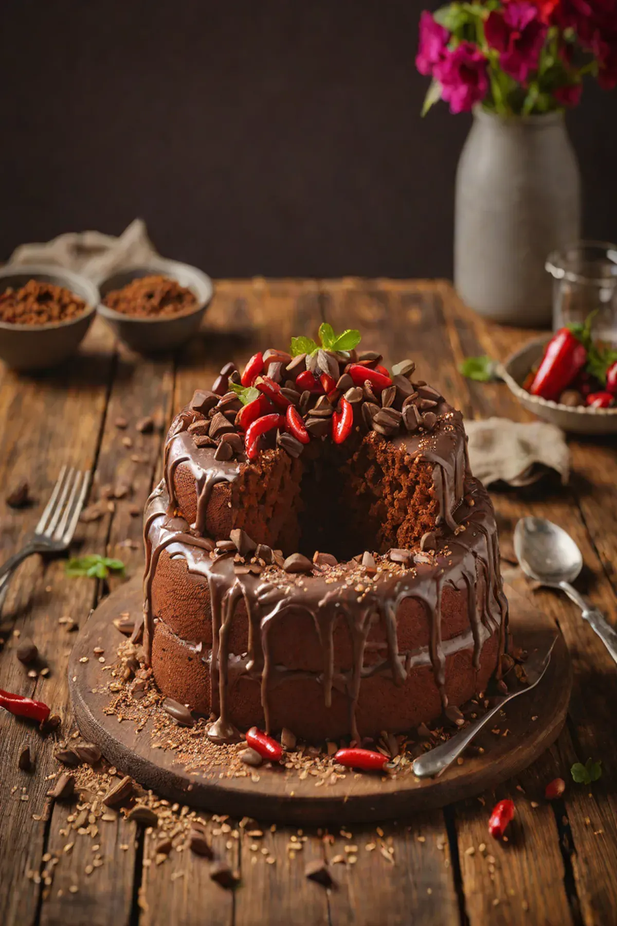 In a medium bowl, whisk together flour, sugar, cocoa powder, baking powder, salt, chili powder, cinnamon, and cayenne pepper.