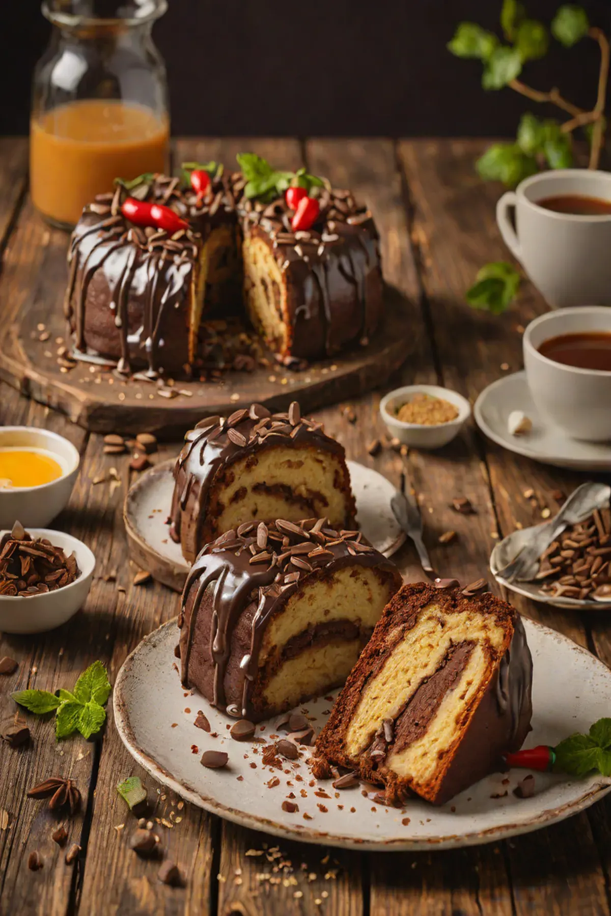 Pour half of the batter into the prepared cake pan. Top with the chilli-chocolate mixture. Repeat the layers.