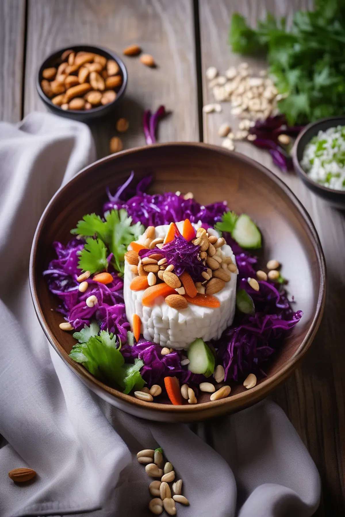 A refreshing Asian-inspired salad featuring goat cheese, crunchy veggies, and a zesty dressing.