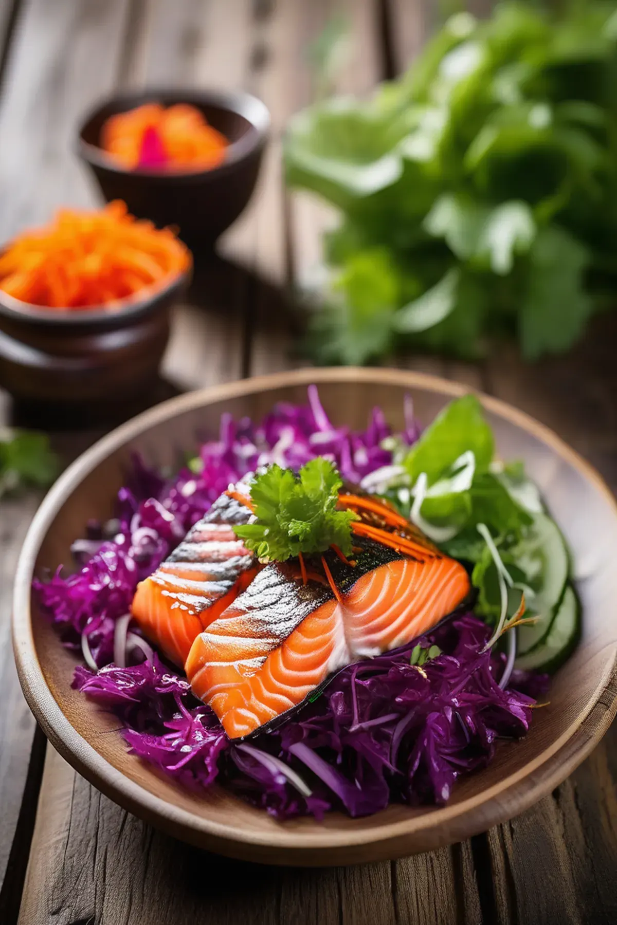 A fresh and flavorful salad made with pan-seared salmon, crunchy vegetables, and a tangy Asian-inspired dressing.