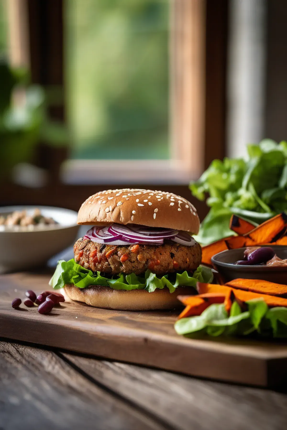 Chipotle bean burger with sweet potato wedges