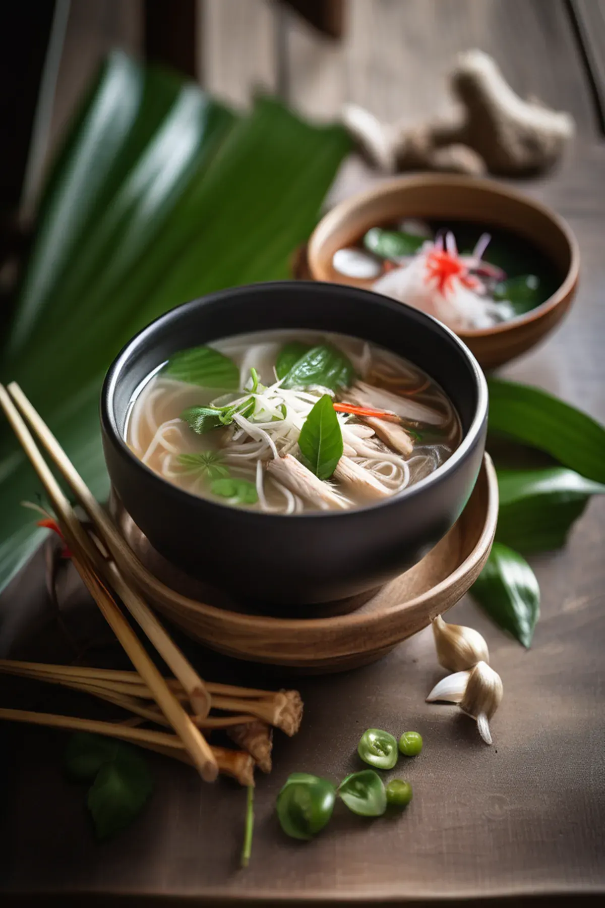 To serve, place some rice noodles in a bowl and ladle the hot broth and chicken over the top.