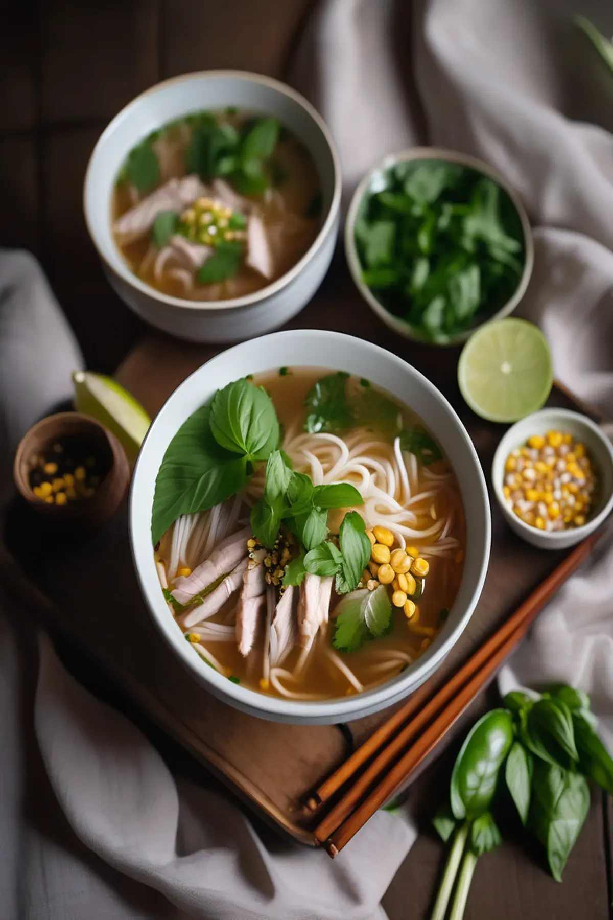 Ladle the hot pho into bowls. Garnish with basil, mint, and scallions.