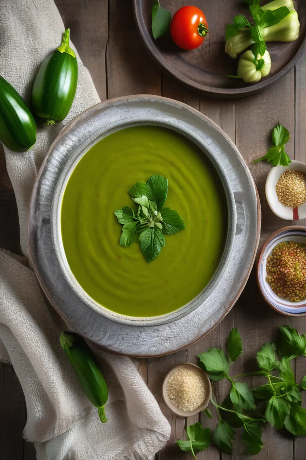 A refreshing summer soup featuring courgette, garlic, and aromatic herbs.