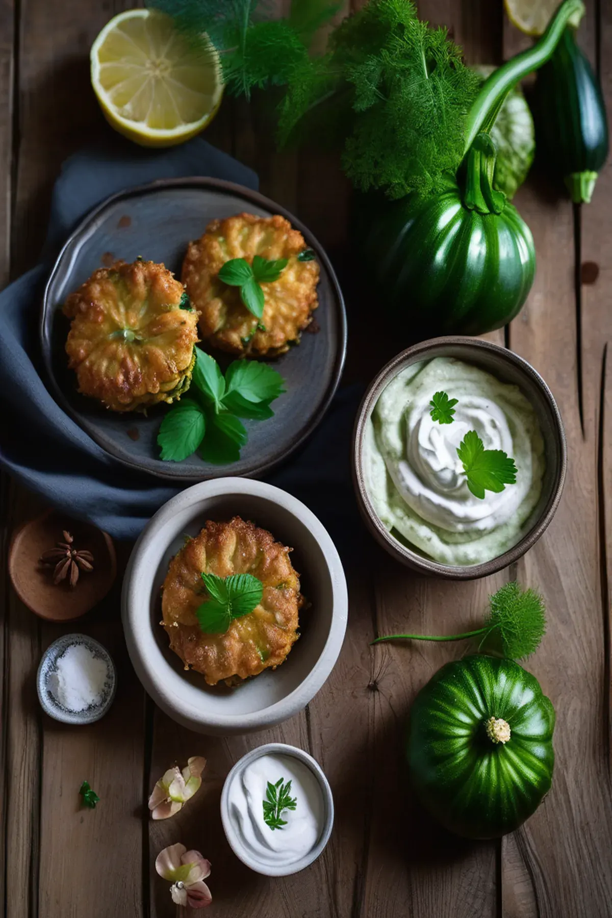 Courgette & lemon frittelle with whipped ricotta and honey