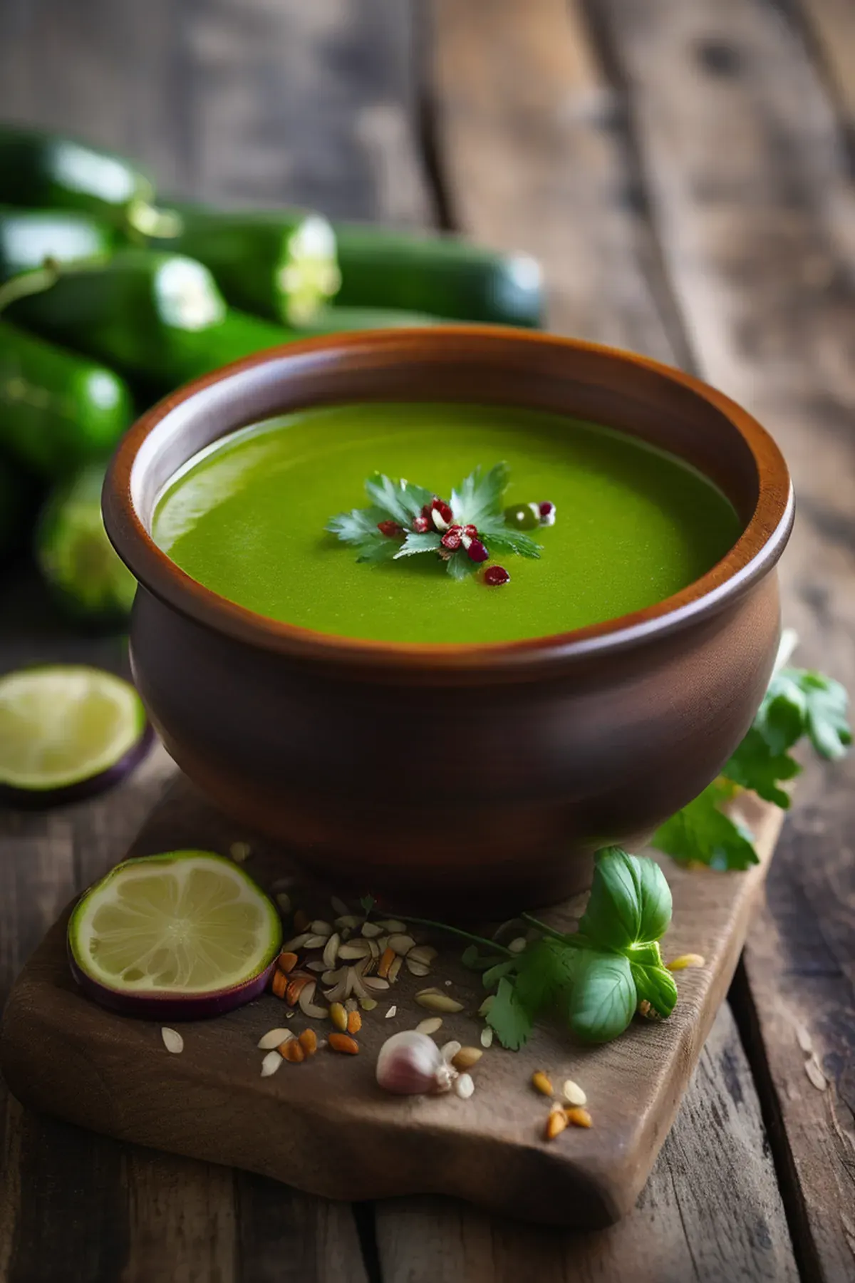 A refreshing summer soup featuring courgette, garlic, and aromatic herbs.