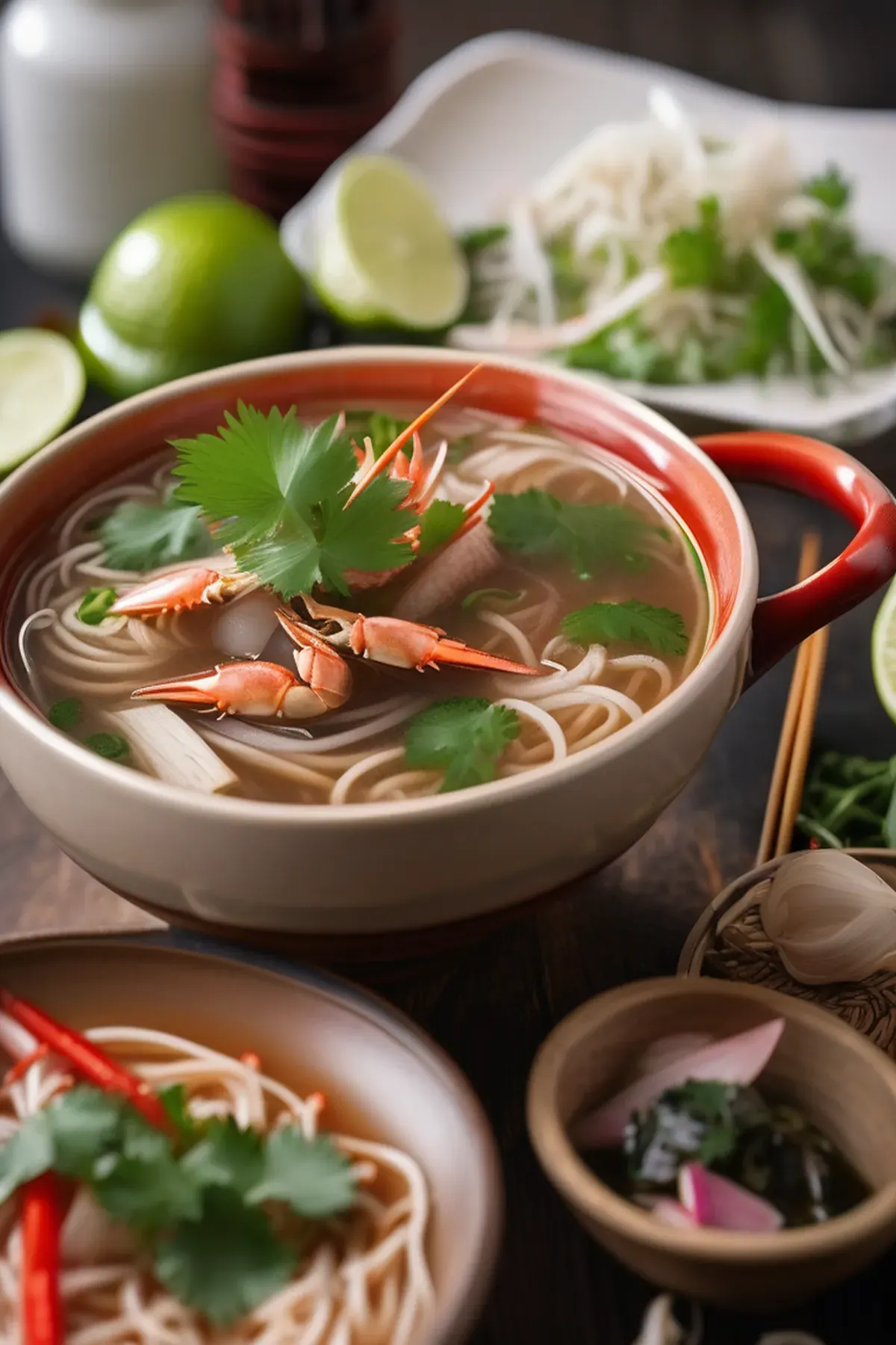 A flavorful Vietnamese-inspired noodle soup featuring succulent crab meat, served in a rich broth.