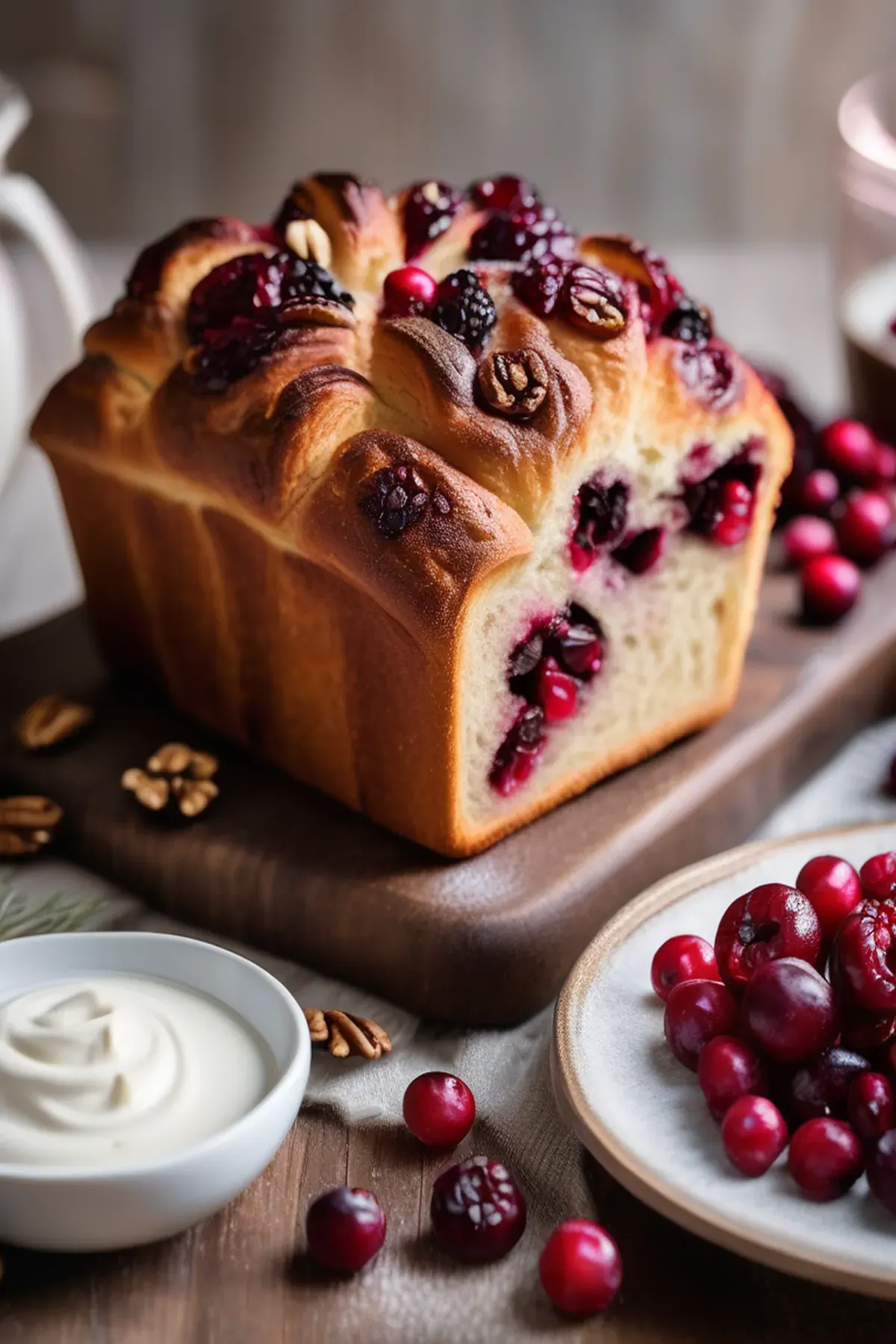 A luxurious, buttery brioche studded with tart cranberries and crunchy walnuts, perfect for a special breakfast or brunch. The rich dough yields a tender crumb with delightful bursts of flavor.