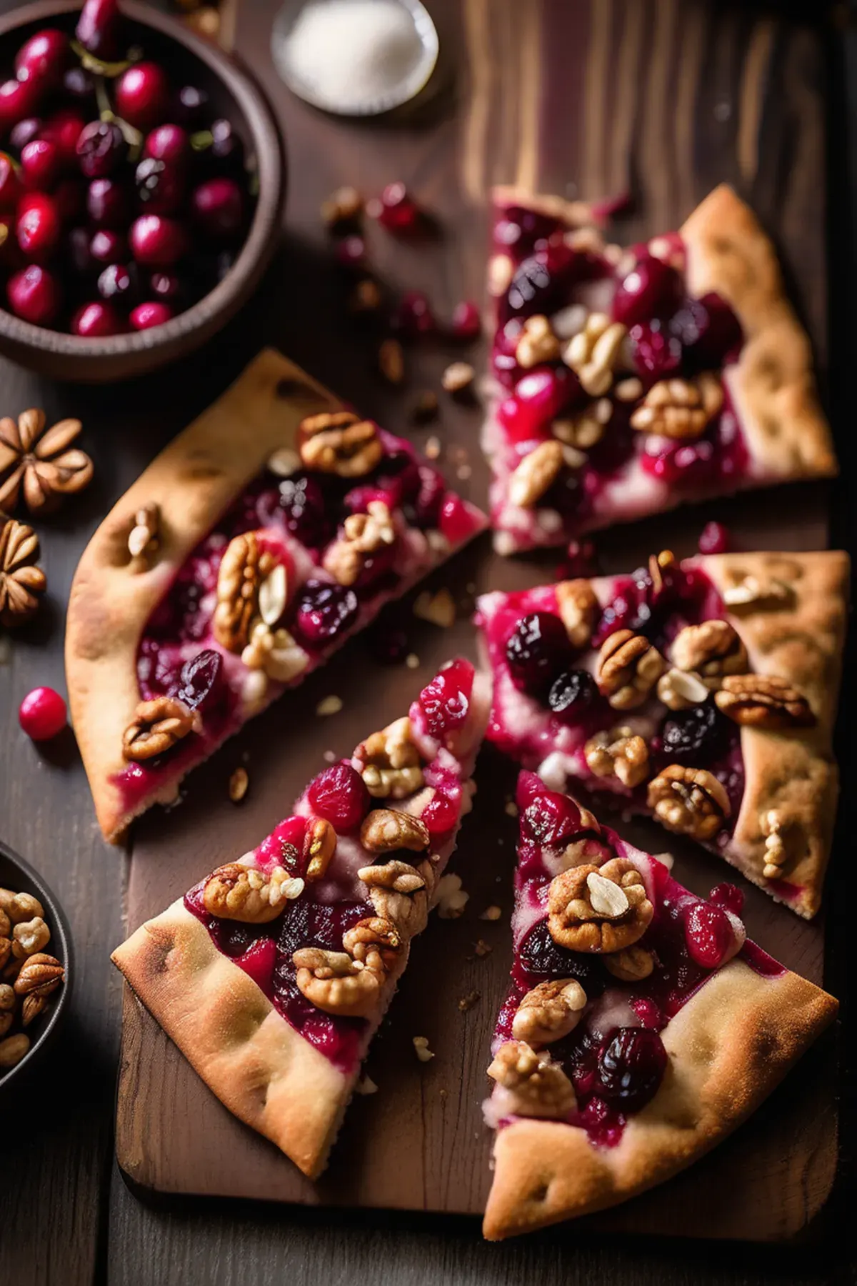 A rustic, crusty flatbread studded with tart cranberries and crunchy walnuts, perfect as an appetizer or alongside soups and salads.