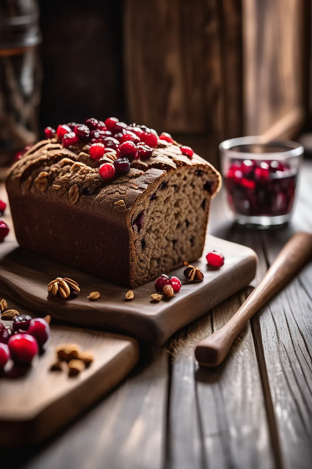 A hearty, rustic rye bread studded with tart cranberries and toasted walnuts, delivering a perfect balance of nutty depth and fruity brightness in every slice.