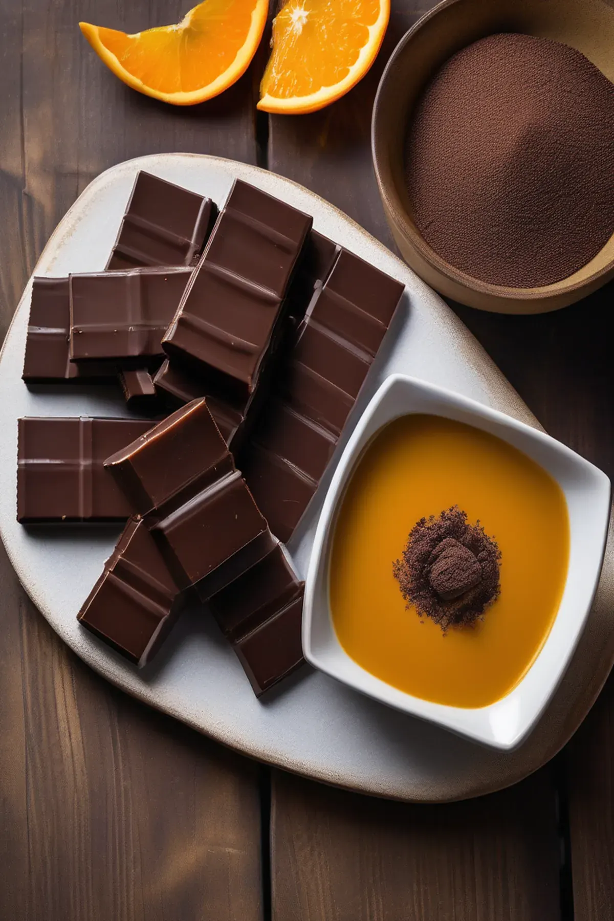 Once the puffs are cool, fill with a tangy orange ganache made from equal parts dark chocolate and confectioner's sugar, whisked with orange juice and orange zest.