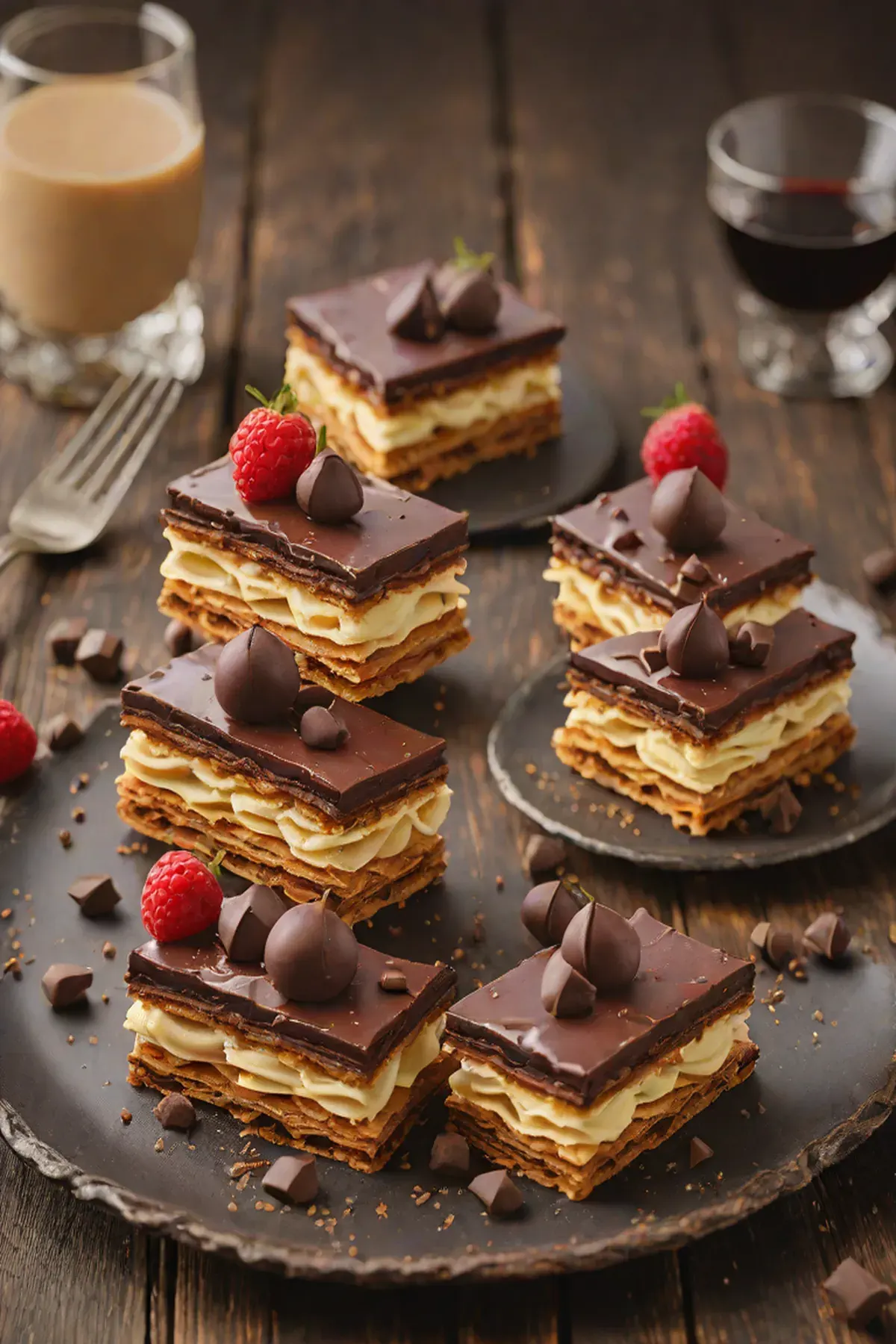 To assemble the mille-feuille, place a layer of pastry cream on the bottom of a serving dish, followed by a layer of pastry rectangles.