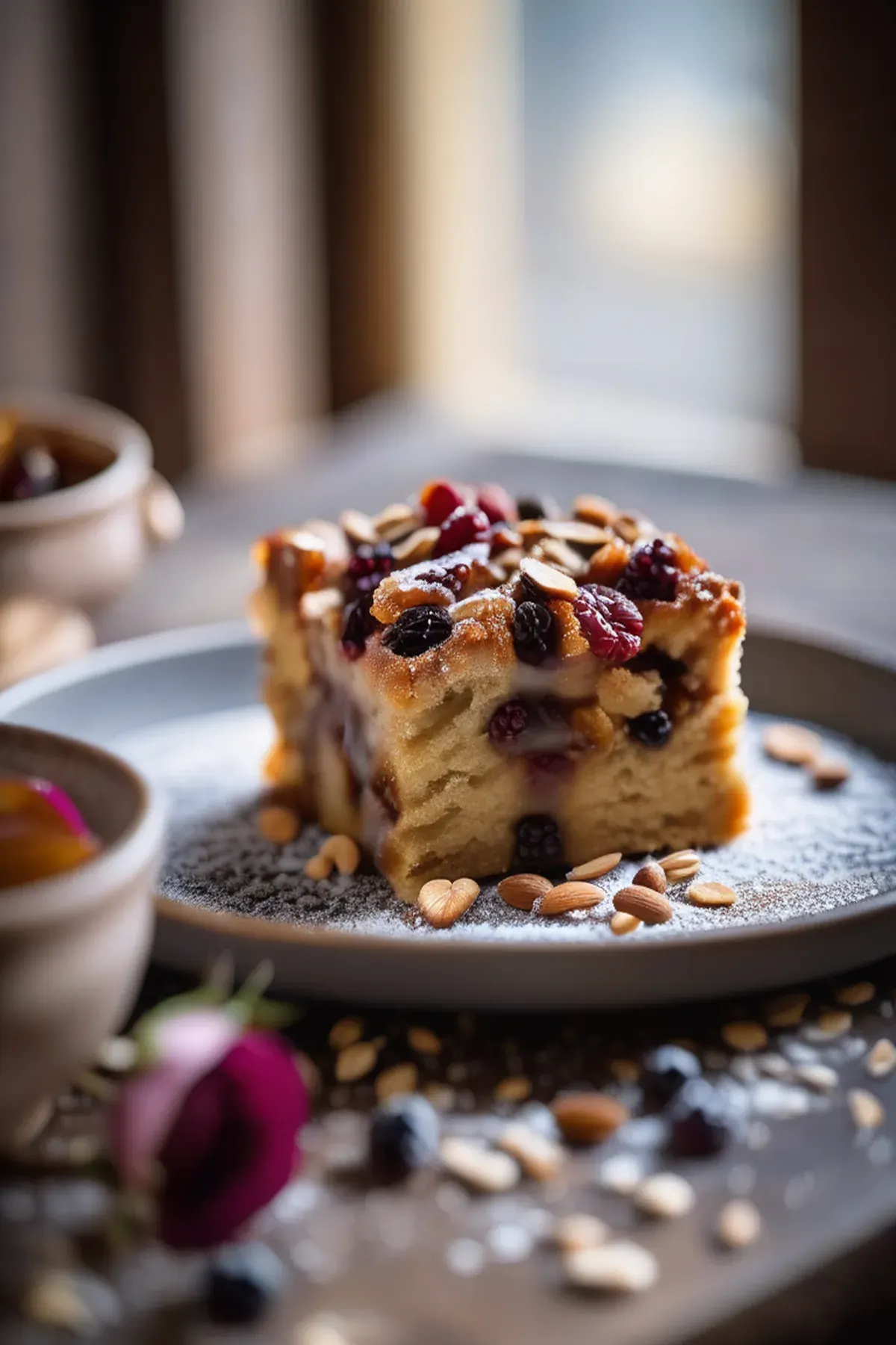 Dust the pudding with powdered sugar and top with dark chocolate shavings or chopped nuts.