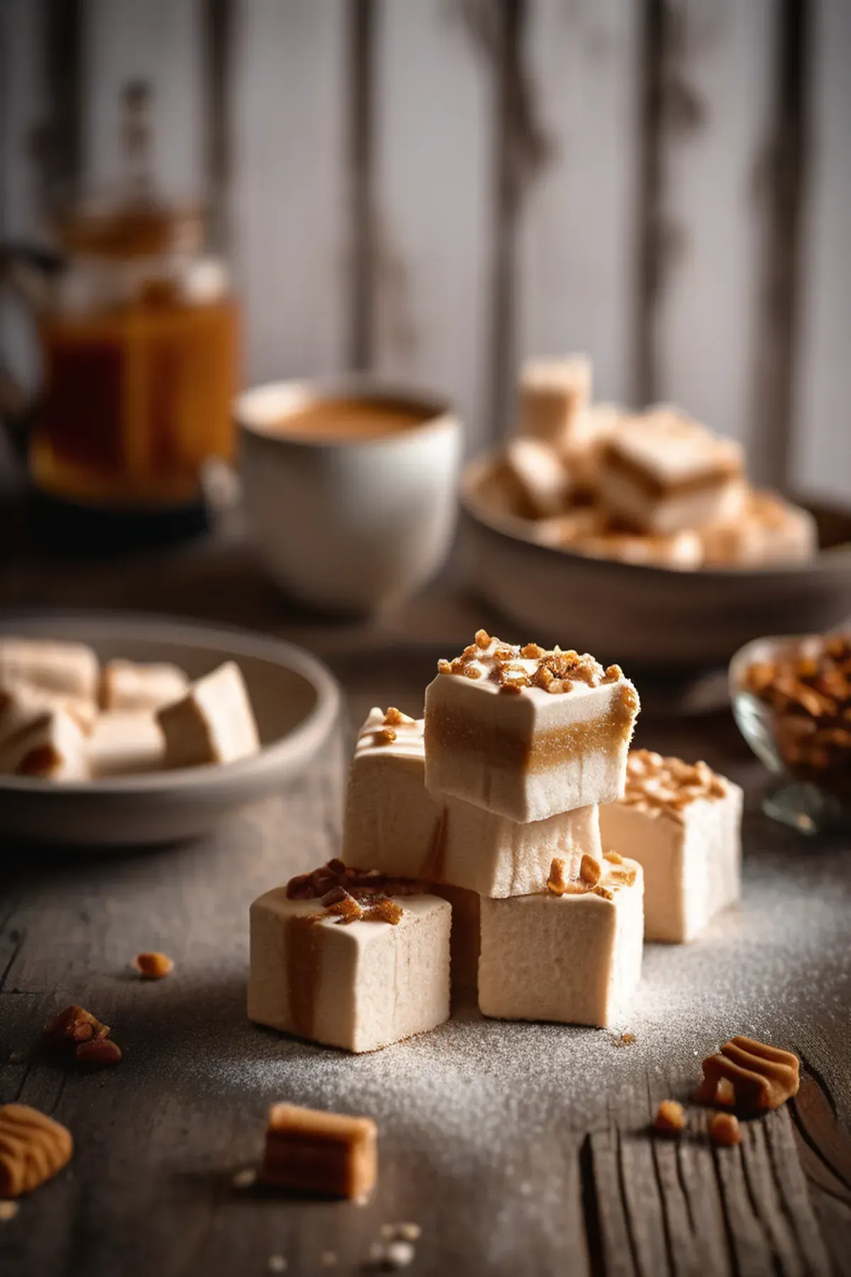 Fluffy marshmallows infused with the deep, caramel flavor of dulce de leche, perfect for snacking or adding to desserts.