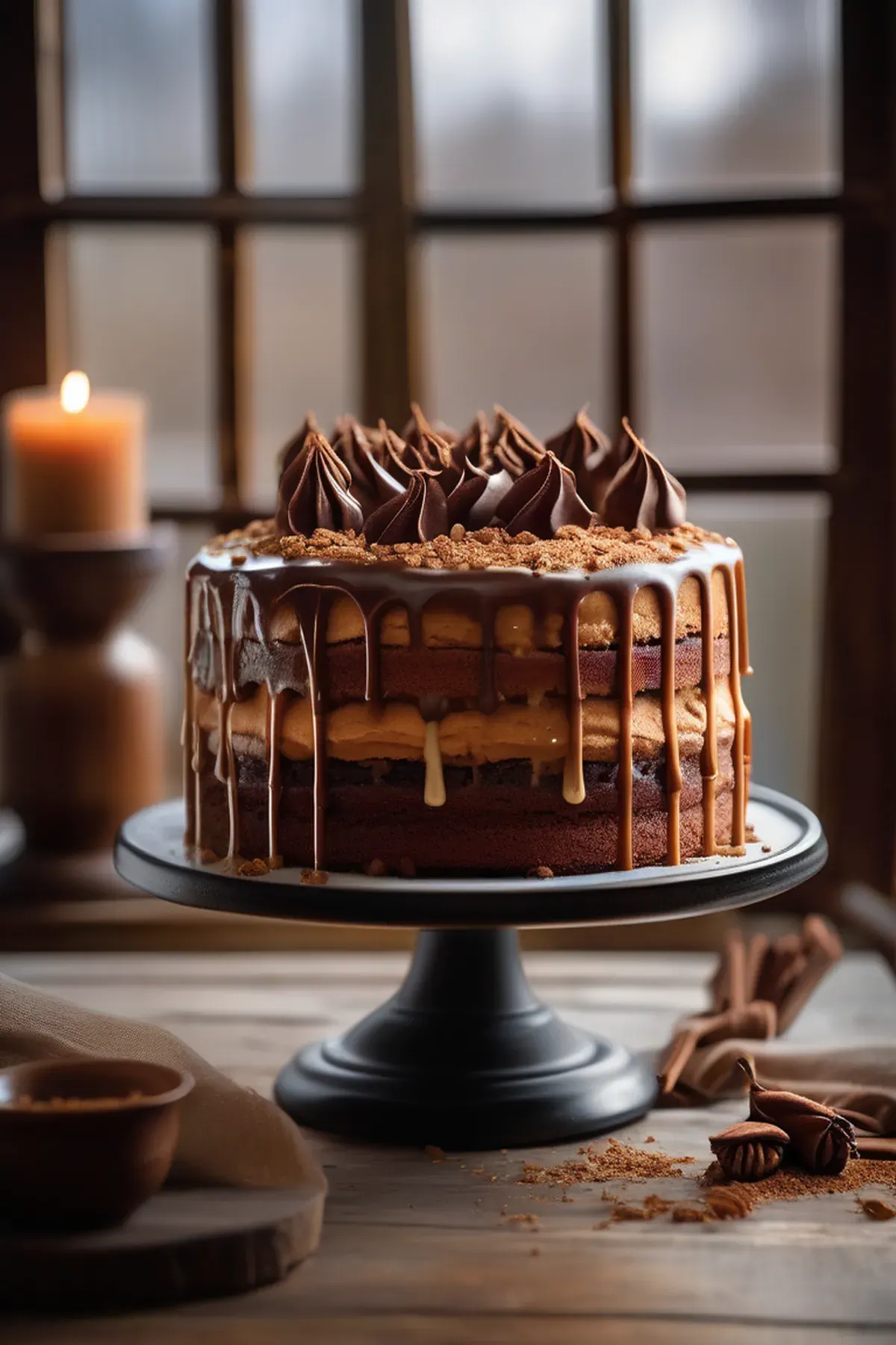 Moist chocolate cake topped with a gooey dulce de leche and crunchy chopped nuts.