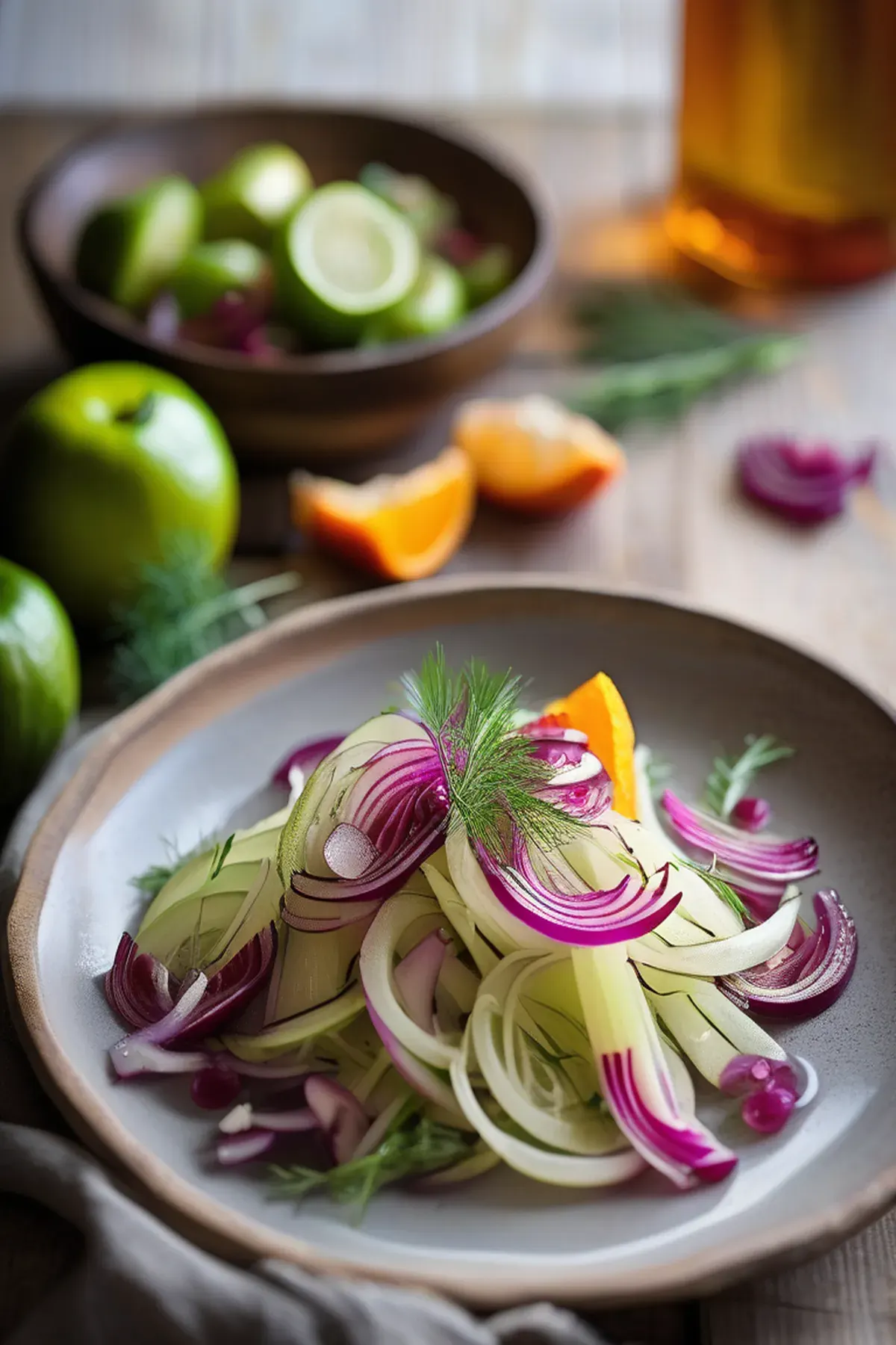 In a large bowl, combine the sliced fennel, orange juice, apple cider vinegar, and Dijon mustard.