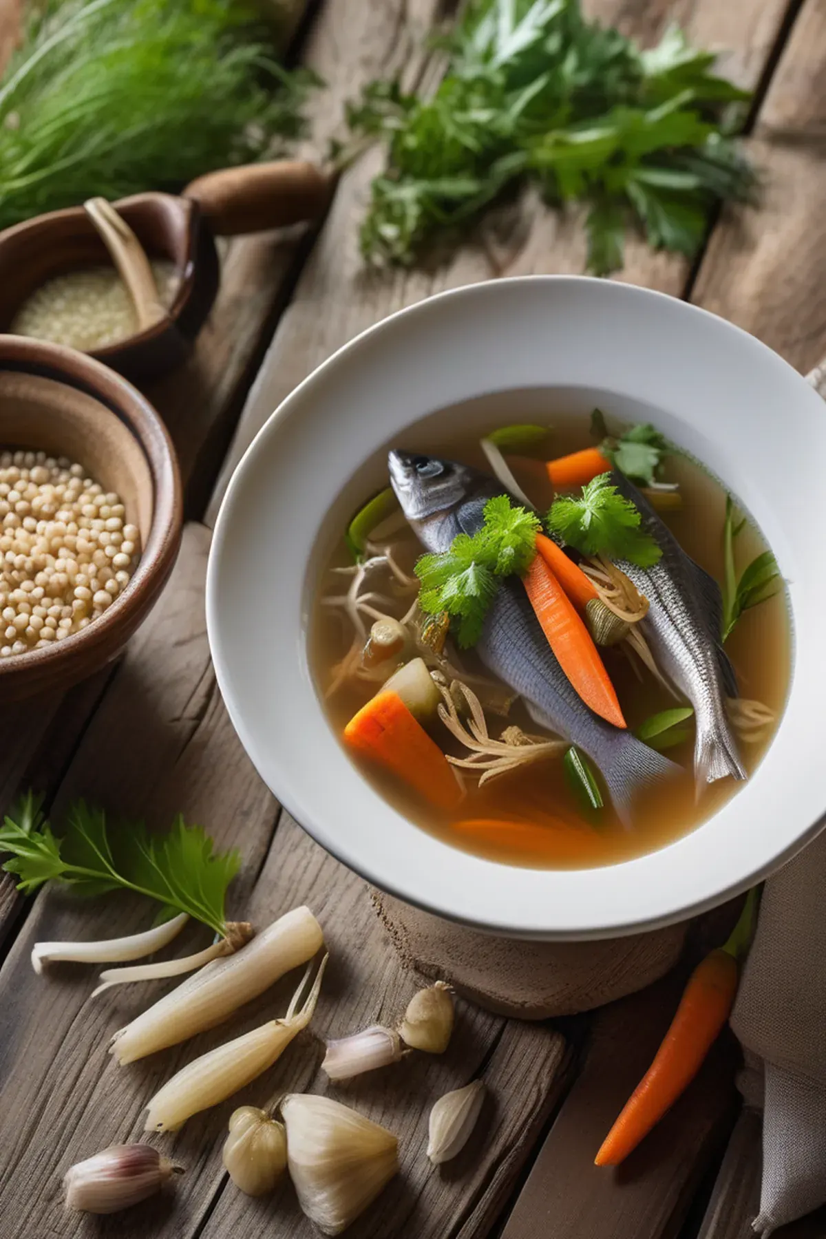 A clear and flavorful broth made with fish and vegetables, perfect for soups or sauces.