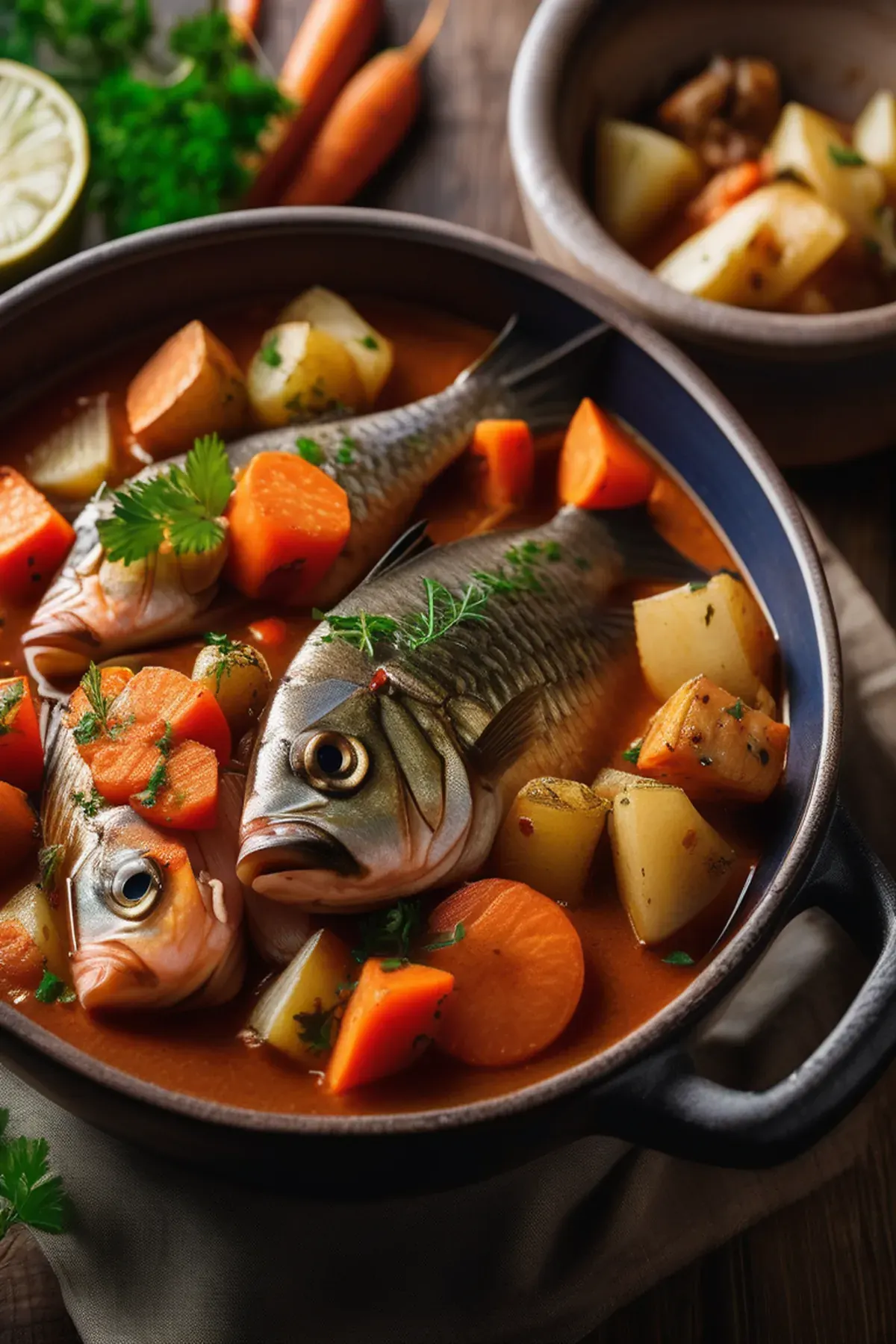 A hearty, flavorful fish stew with a variety of vegetables and aromatics.